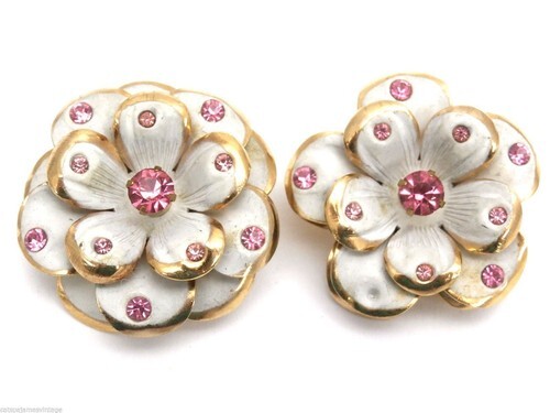 Vintage Retro Coro Brooches Matching White Enamel w Pink Rhinestones