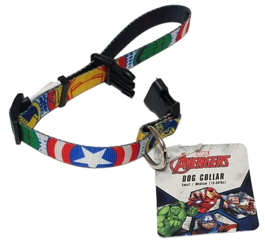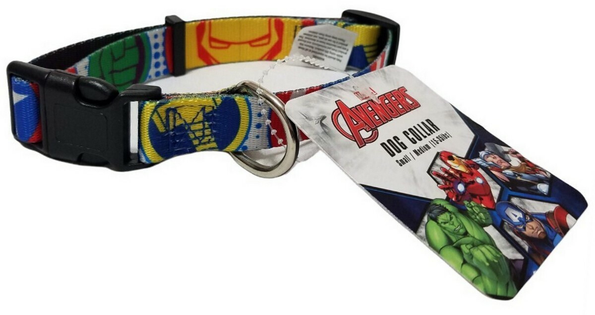 Assemble the Team! Give your pup the ultimate superhero look with this officially licensed Marvel Avengers Dog Collar. Featuring high-quality graphics of the Earth's Mightiest Heroes?including Iron Man, Captain America, Thor, and The Hulk?this collar is perfect for the four-legged fan in your life.