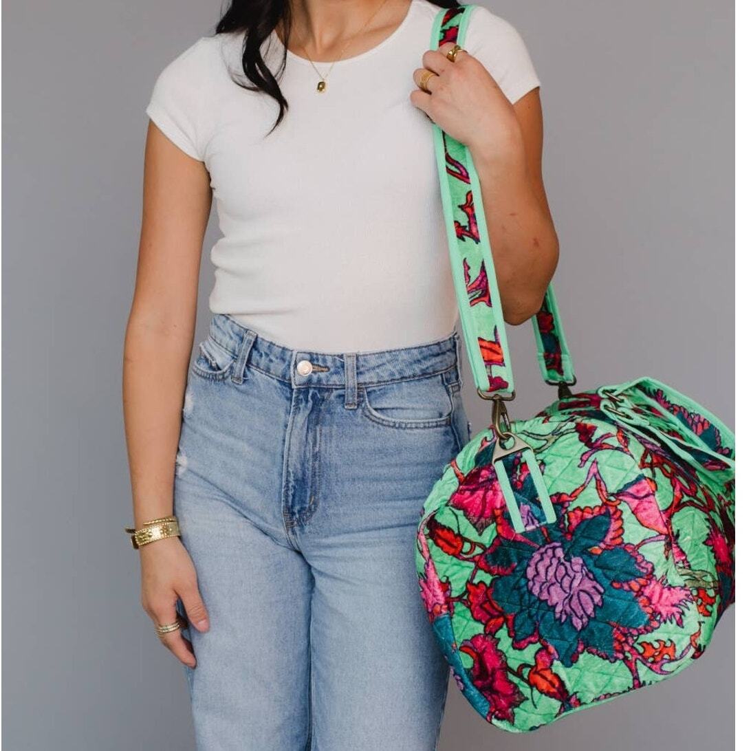 Weekend getaways meet garden-party charm in this spacious floral duffel. The soft mint base blooms with vibrant multicolored florals, while the generous 19" 9" 11" interior holds everything from clothes to shoes to toiletries with room to spare.