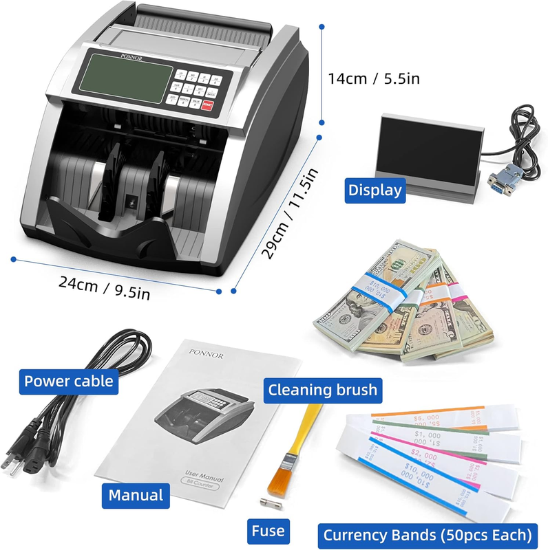 3.7? Large LCD Display: PONNOR cash counter with a built in 3.7? super large LCD screen, it can clearly display different data and greatly reduces the possibility of false counts; the external display provides dual views, allows customers from different angles to read data at any time.