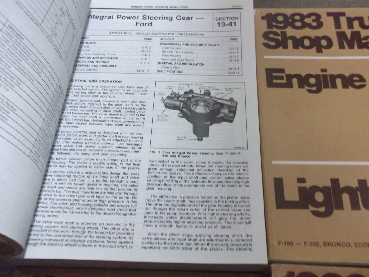 Factory 1983 Ford F-150/100,250,350,BRONCO,Econoline,E100,200,350 factory body/chassis/electrical service manual,engine service manual, pre delivery maintenance manual,electrical and vacuum troubleshooting manual,and the engine emissions diagnosis manuals