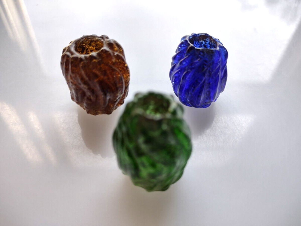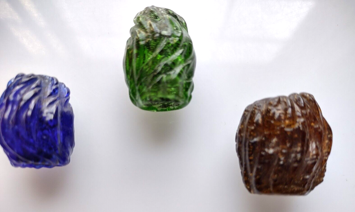 Rare mid 1800's handmade large size glass curtain pulls. Colors are green translucent, deep blue translucent, and brown semi translucent. Sizes vary but are around 1" tall and .75" wide. Unused condition. They have a great look with irregular textured patterns. Can also be used to make unique one of a link necklaces. stock#3pulls2-9-2024-beads1