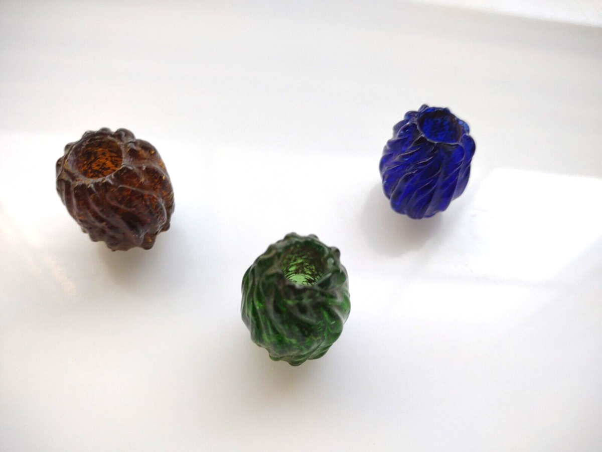 3 Antique Mid 1800's Large Rare American Glass Curtain Pulls Blue Green Lt Brown