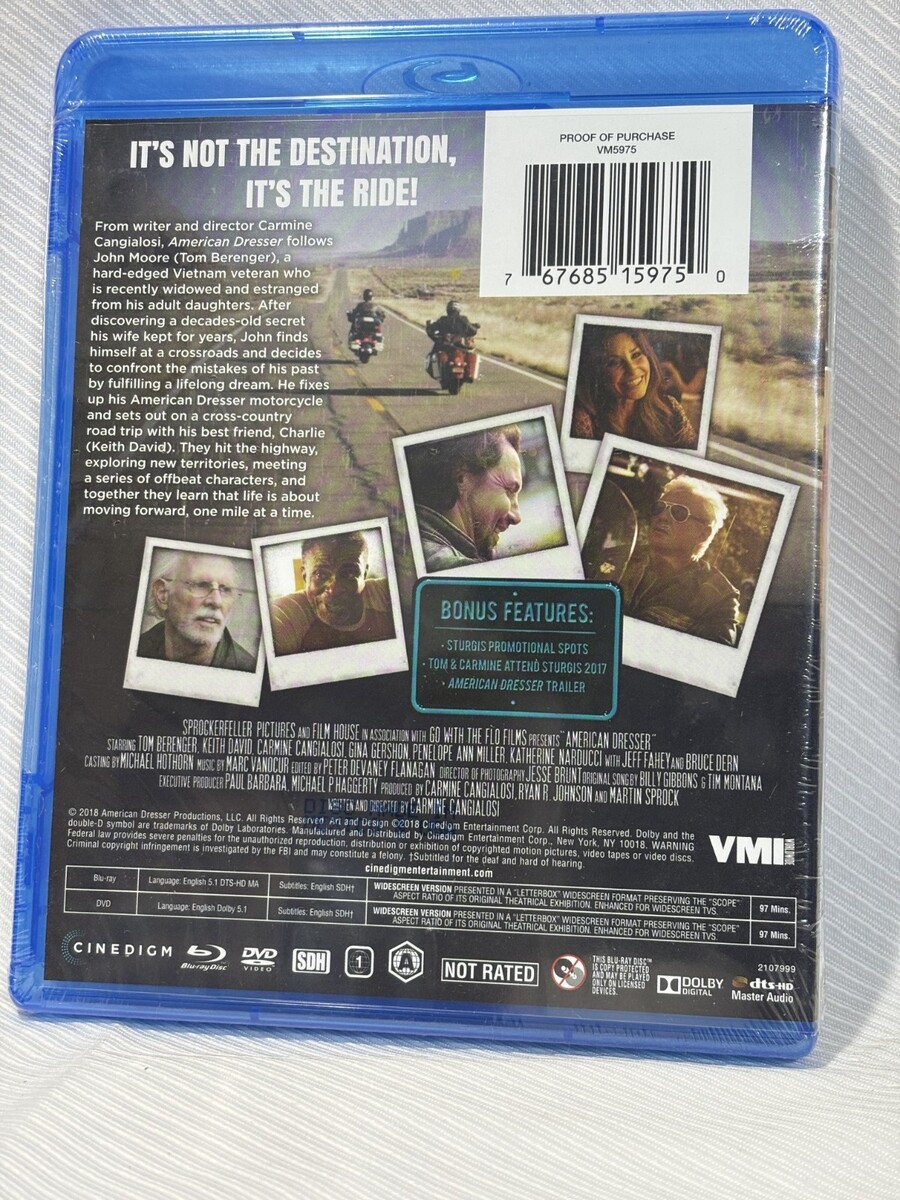 Description of item: Two lifelong friends set out on the road trip of a lifetime in American Dresser, a heartfelt drama about friendship, aging, and the search for meaning later in life. After years of putting life on hold for responsibilities and regrets, the pair decide to ride across America on their vintage motorcycles, determined to experience the freedom they once dreamed about.