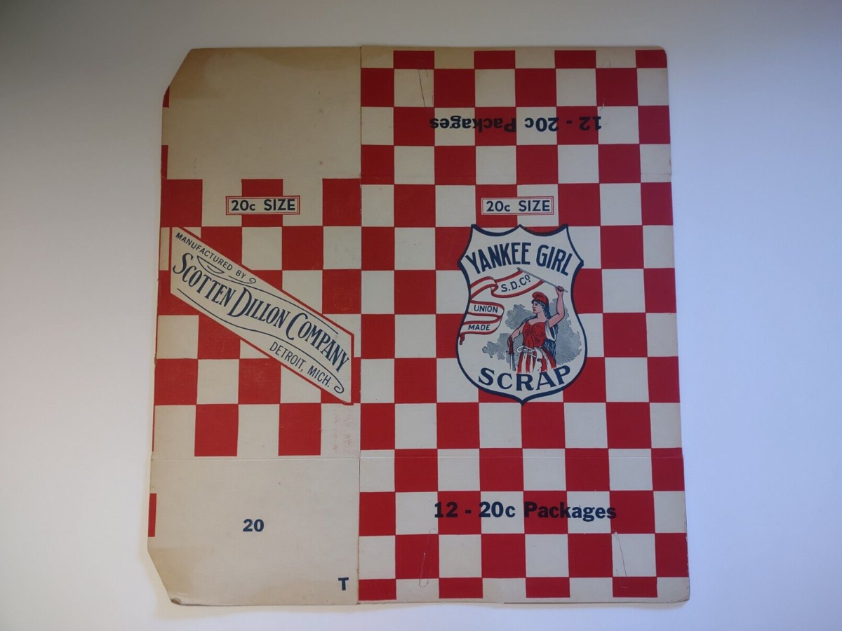 Vintage unused old stock box for Yankee Girl Scrap. Box will be shipped flat. Some photos shows how it looks when tabs are inserted. Has age wear soiling to edges but colors are crisp and bright. Size when flat is 16" x 14.5". Size when assembled is 7.5" x 8.25" x 5.25".