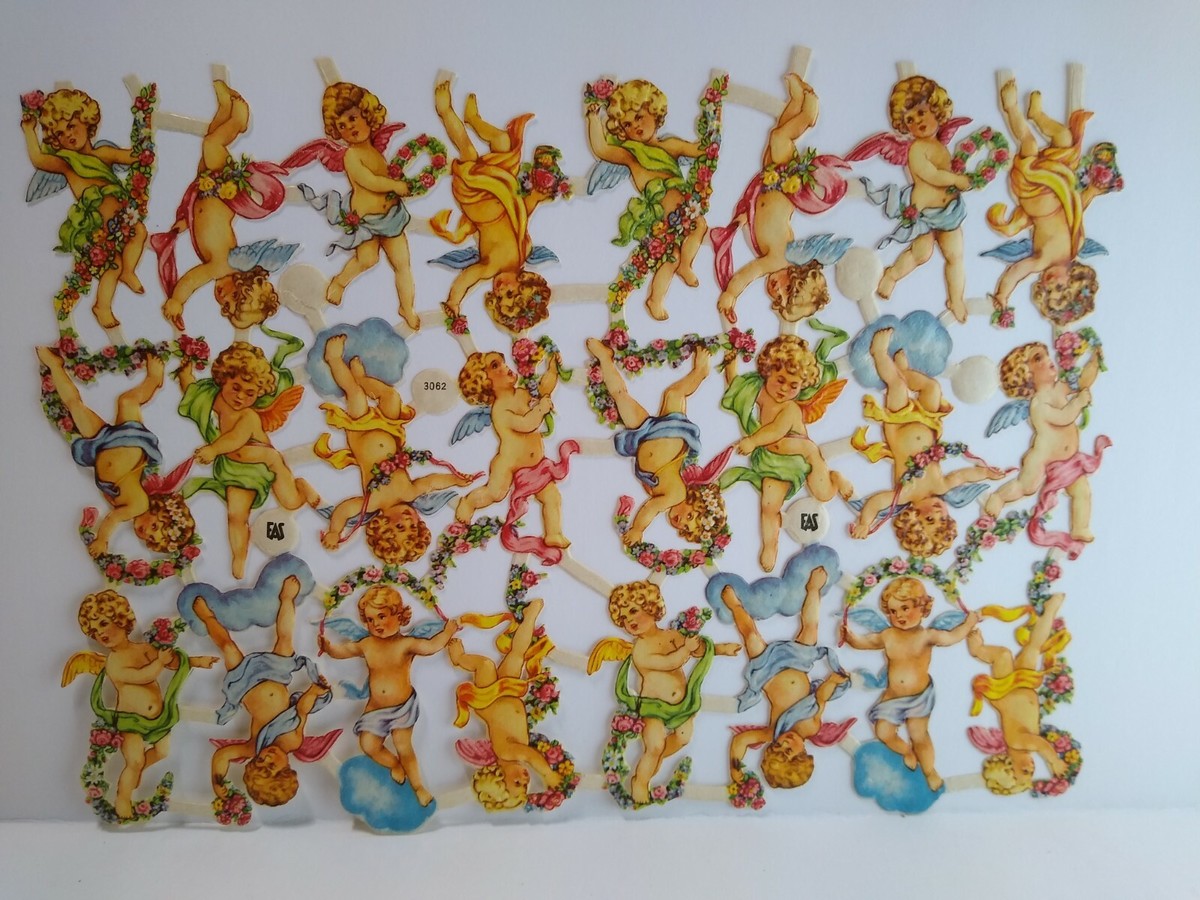 Original vintage circa 1930's era die-cut Cherub Angels. These are attached and marked EAS and items number 3062. Entire sheet is 9" x 6.5". Cherubs are about 2" size.