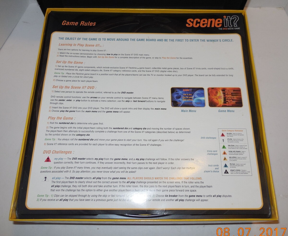 For Sale is a 2002 Scene It DVD Game 100% complete. it in good Used condition. comes with the Pieces as seen in the pictures provided what you see is what you will receive. Please ask Any and All Questions prior to purchasing. Fast Same or Next day shipping with Free Delivery Confirmation within the U.S. Payment Due within 7 days of purchase (if you need more time please let us know In advance) we love to combine shipping is always a Yes and Most of the time Additional Items Ship for free.