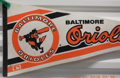 For Sale is a rare and hard to find Vintage Baltimore Orioles Full Size 12" x 30" Felt Pennant. Its good USED Condition with Some Minor Handling wear as pictured Including a few pin holes and some creasing. Shipping Stated is for ROLLED SHIPPING of the pennant we can also ship it FLAT which will Cost More in shipping charges (because of Dimensional Surcharges by the USPS UPS And FeDex) if you prefer to have your pennants Shipped FLAT Please let us know Prior to Making your payment/Purchase. . Please ask Any and All Questions prior to purchasing. Nice addition to any Sports Memorabilia Collection. Fast Same or Next day shipping with Free Delivery Confirmation within the U.S. Payment Due within 7 days of purchase (if you need more time please let us know In advance) we love to combine shipping is always a Yes and Most of the time Additional Items Ship for free.
