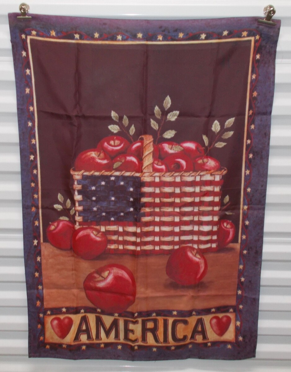 For Sale is a rare and hard to find 28" X 40" GARDEN FLAG America July 4th Red White blue Apples Brown. Its In good used Condition with Some Minor Handling wear as pictured. Please ask Any and All Questions prior to purchasing. Fast Same or Next day shipping with Free Delivery Confirmation within the U.S. Payment Due within 7 days of purchase (if you need more time please let us know In advance) we love to combine shipping is always a Yes and Most of the time Additional Items Ship for free.