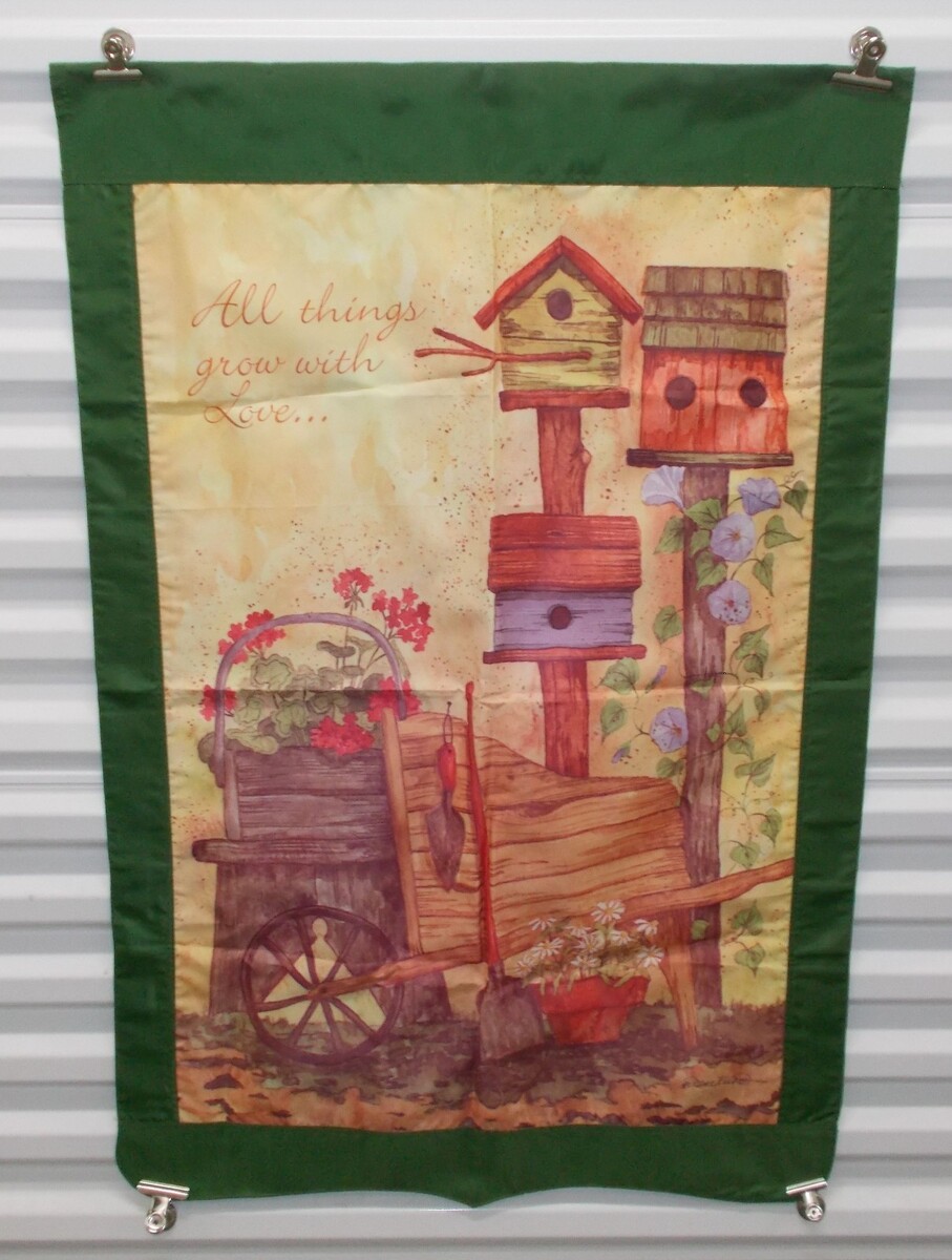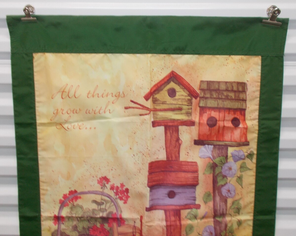 For Sale is a rare and hard to find 28" X 42" GARDEN FLAG All Things Grow with Love Bird Houses Flowers Green Blue. Its In good used Condition with Some Minor Handling wear as pictured. Please ask Any and All Questions prior to purchasing. Fast Same or Next day shipping with Free Delivery Confirmation within the U.S. Payment Due within 7 days of purchase (if you need more time please let us know In advance) we love to combine shipping is always a Yes and Most of the time Additional Items Ship for free.