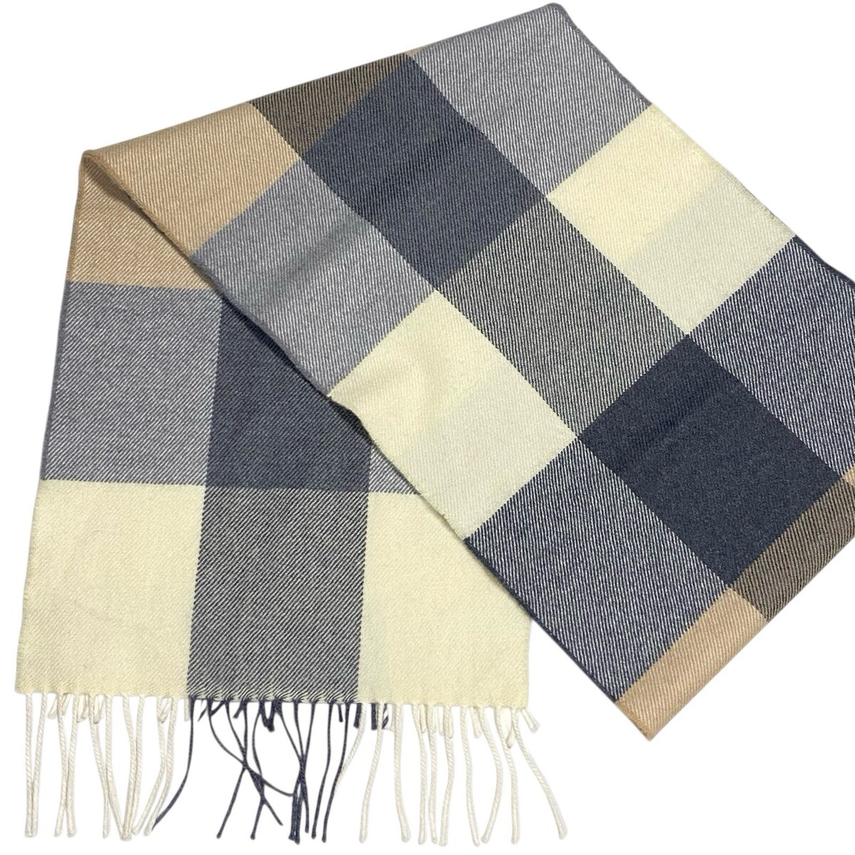 NWT John Hanly 100% Merino Wool Scarf GRAY Cream Camel PLAID 71x12 NEW