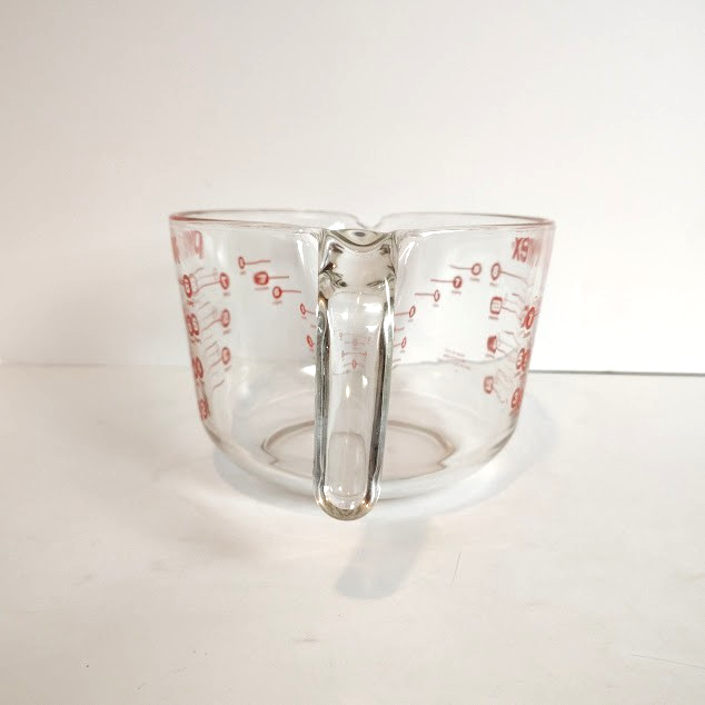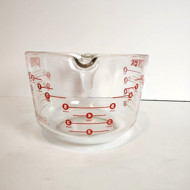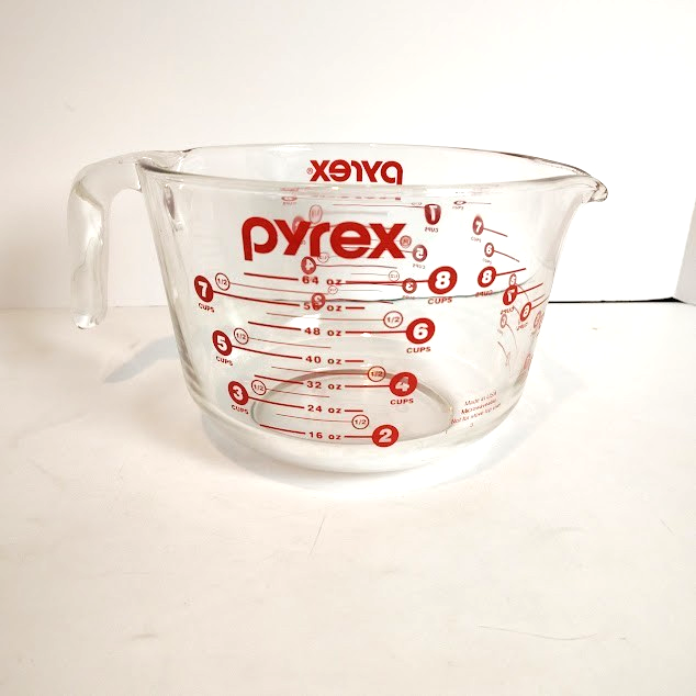 This vintage PYREX 8 Cup Glass Measuring Cup can also be used for a batter bowl. Has red lettering, making it a stylish and functional addition to any kitchen. Made in the United States, this 2 qt measuring cup is not only retro in style, but also features like being refrigerator safe and microwaveable. With measurement markings and a 7.5 inch diameter, this Pyrex measuring cup is generous size to use for your cooking and baking plus it makes a great collector's item for those who appreciate vintage kitchen tools. Very good condition. No breaks, chips, cracks noted.