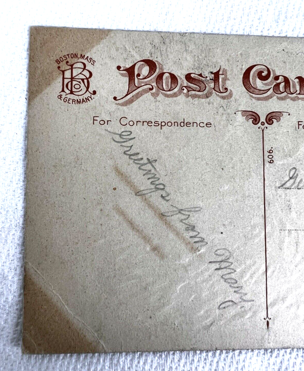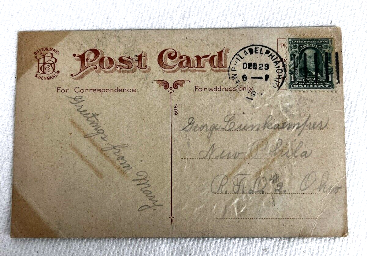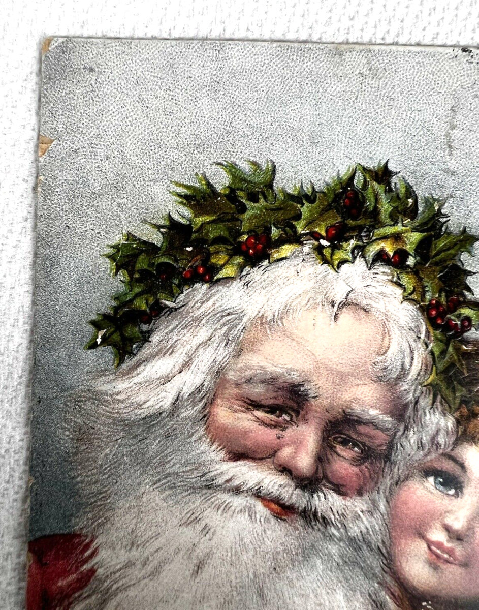 Santa w Wreath of Holly Young Girl Postcard Christmas Greetings 1907 HI Robbin Boston Germany