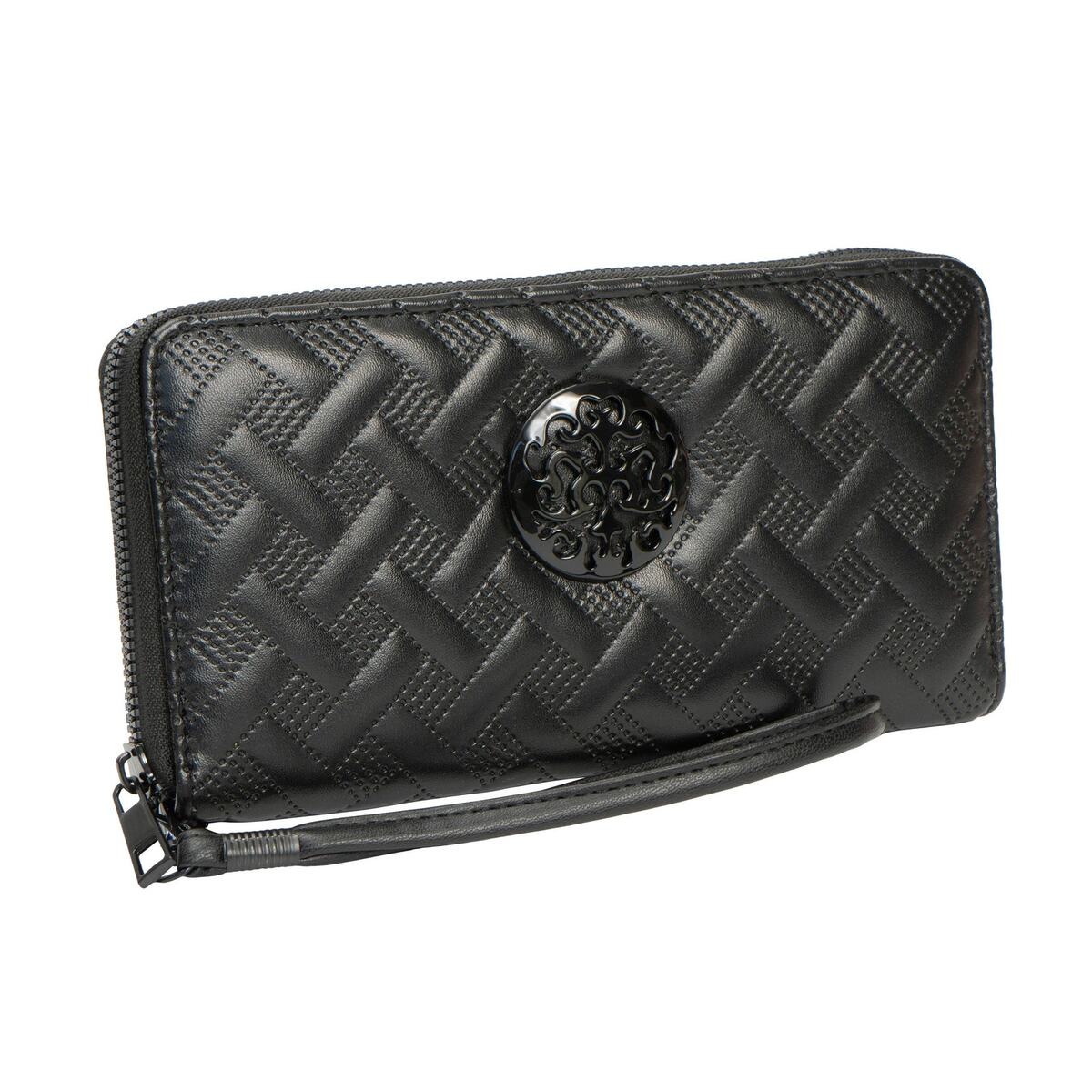 Timeless elegance meets hands-free convenience in this quilted wristlet wallet. The luxurious basket weave quilted pattern creates sophisticated texture, while the signature Rebecca Rifka medallion adds a polished finishing touch. Inside, smart organization keeps everything from cards to coins perfectly in place.