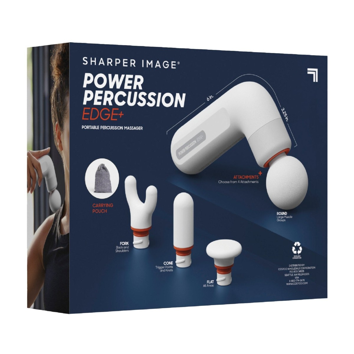The Sharper Image Power Percussion Edge+ is a compact portable percussion massager designed for targeted muscle relief and recovery. This lightweight massage device delivers powerful percussive therapy to help soothe sore muscles, reduce tension, and improve circulation throughout the body. The ergonomic design makes it easy to reach difficult areas like the back, shoulders, neck, and legs. Features multiple speed settings to customize your massage intensity and comes with interchangeable attachment heads for different muscle groups and massage techniques. The cordless design with rechargeable battery provides convenience and portability, making it ideal for use at home, the gym, or while traveling. The whisper-quiet motor ensures a peaceful massage experience without disturbing others.