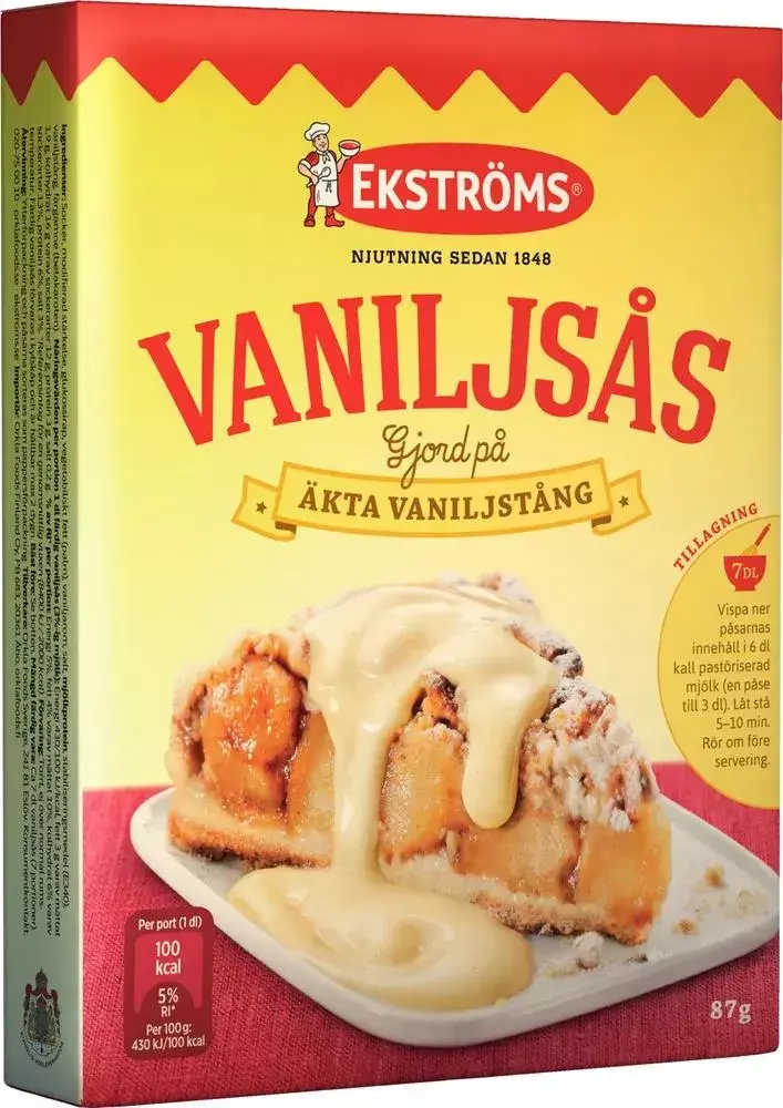 Ekströms Vanilla Sauce Powder is an incredibly fine vanilla sauce. So simple but so good. It goes incredibly well with the pie or the apple cake. Ekströms Vanilla Sauce Powder has a homemade feel and solid taste but is prepared simply and quickly by cold whipping with milk.
