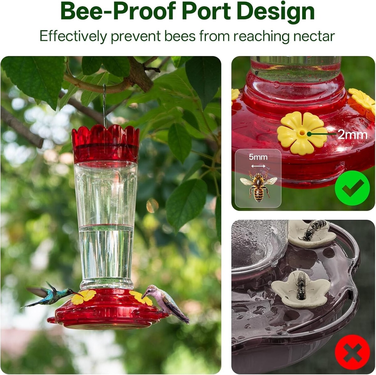 Ant Bee Guard: Features a top-fill ant moat that provides a reliable water barrier against ants, and exclusive flower ports that prevent bees from accessing the nectar.