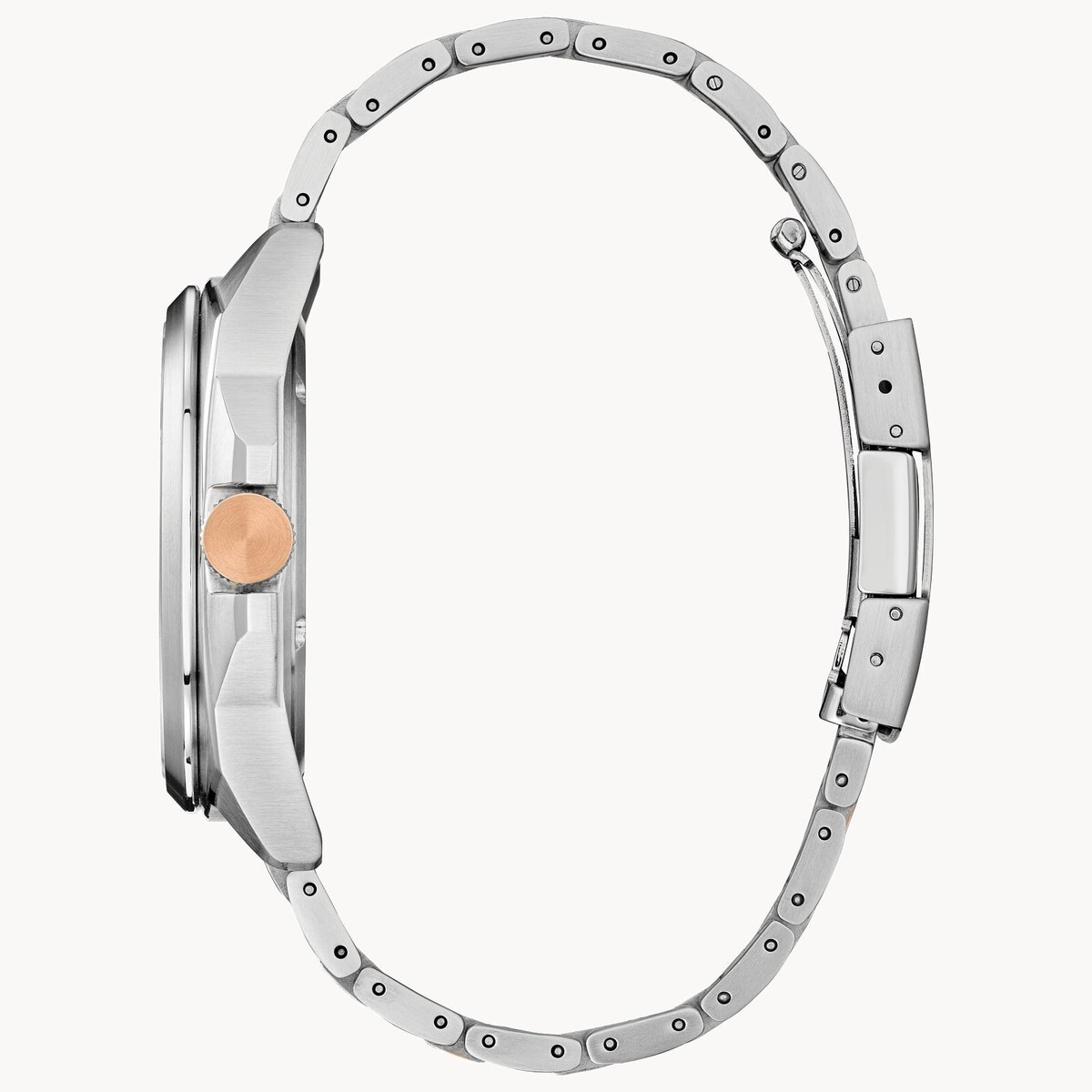 The two-tone stainless steel bracelet features a fold-over clasp with