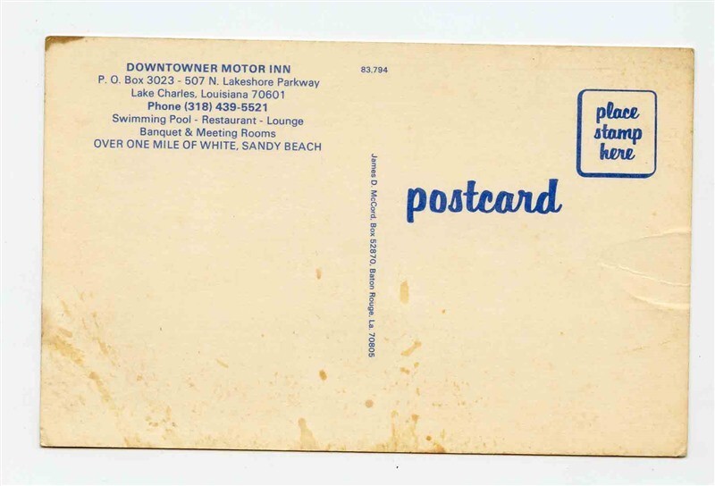 An unmailed postcard. Downtowner Motor Inn Postcard. Was located o nN Lakeshore Parkway in Lake Charles Louisiana