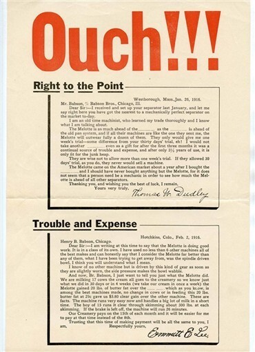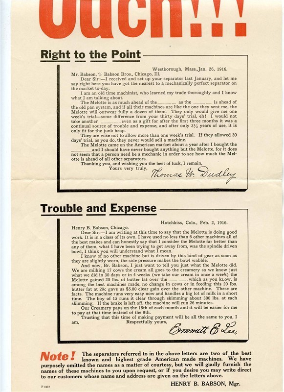An original large single page with blank back. Dated 1916. Babson Melotte Butter Cream Separator Reference Letter with headline OUCH . Measures about 8 1/4" x 13 1/4".