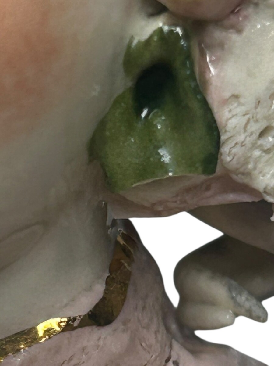 As is standard for authentic 75-year-old Cordey pieces, this figurine has minor breaks (notably to the fragile dipped lace and small areas of the spaghetti hair/rose petals). Please study the high-resolution photos carefully as they are part of the description. Despite these small age-related imperfections, she displays beautifully and remains a quintessential piece of New Jersey ceramic history.