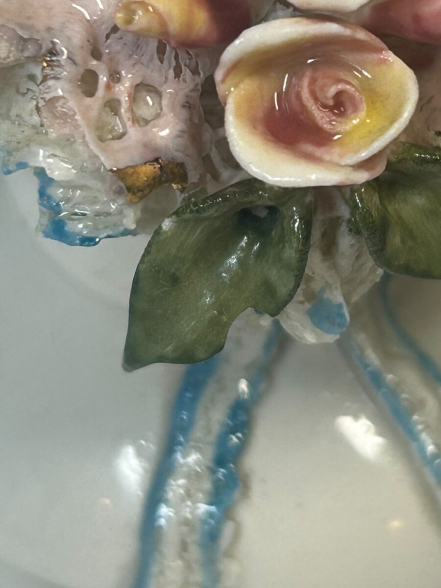 ? Accents: Adorned with delicate applied porcelain roses and accented with gold gilt.