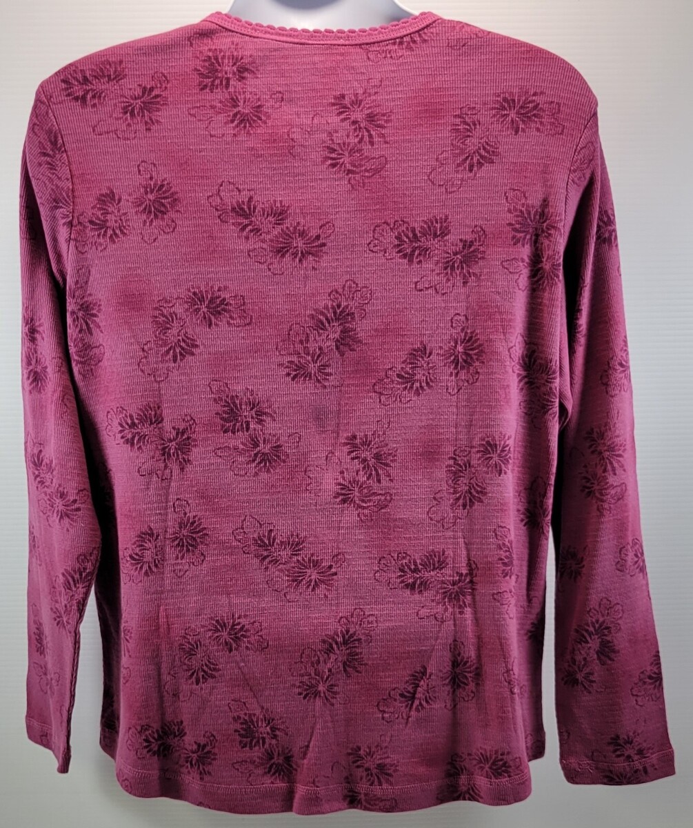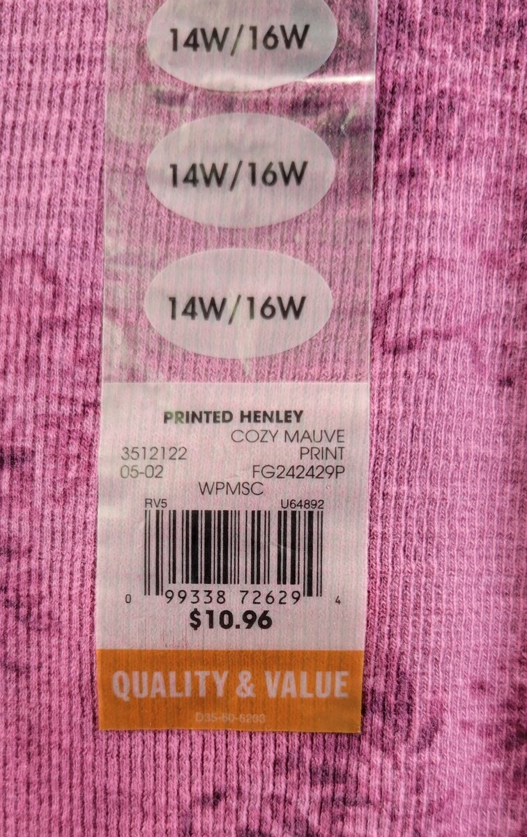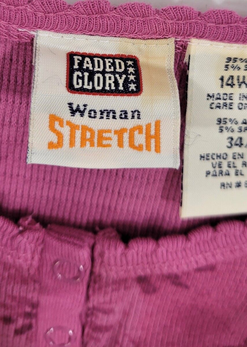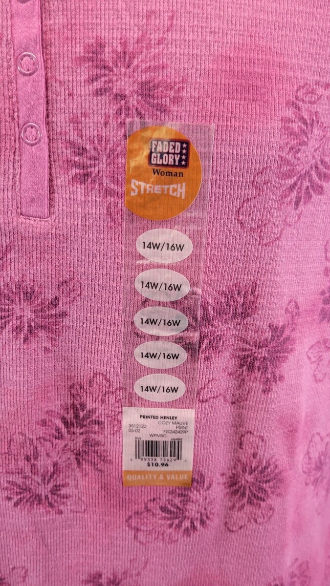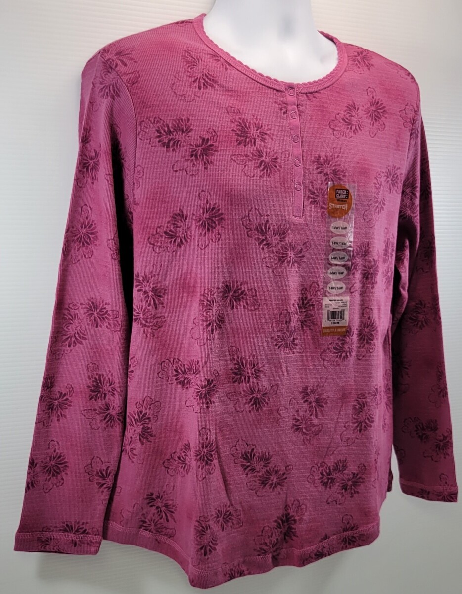 L) Faded Glory Woman Stretch Printed Henley Cozy Malve 14W/16W