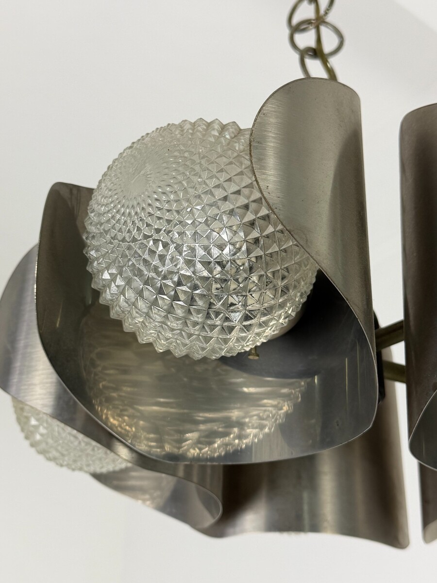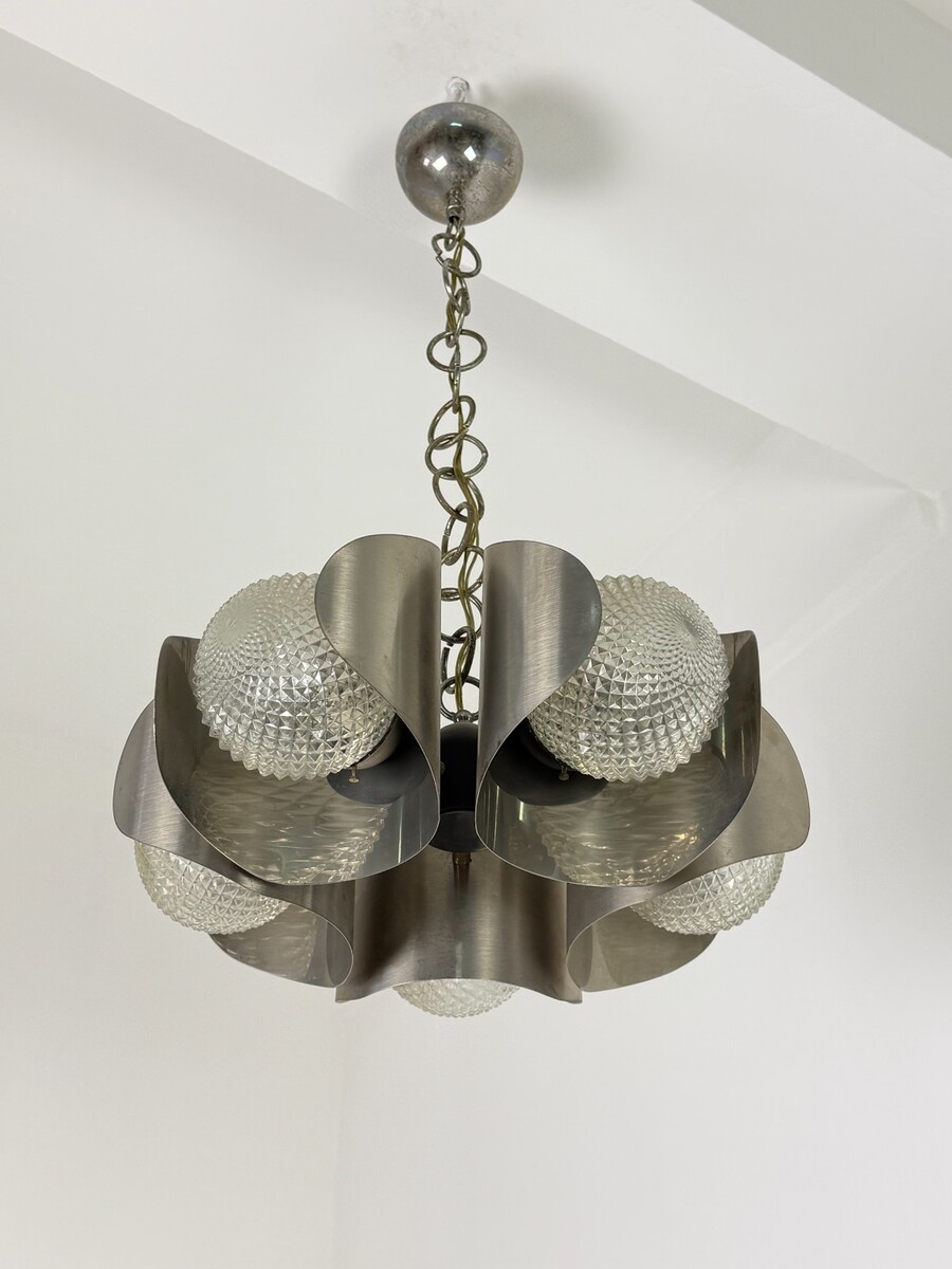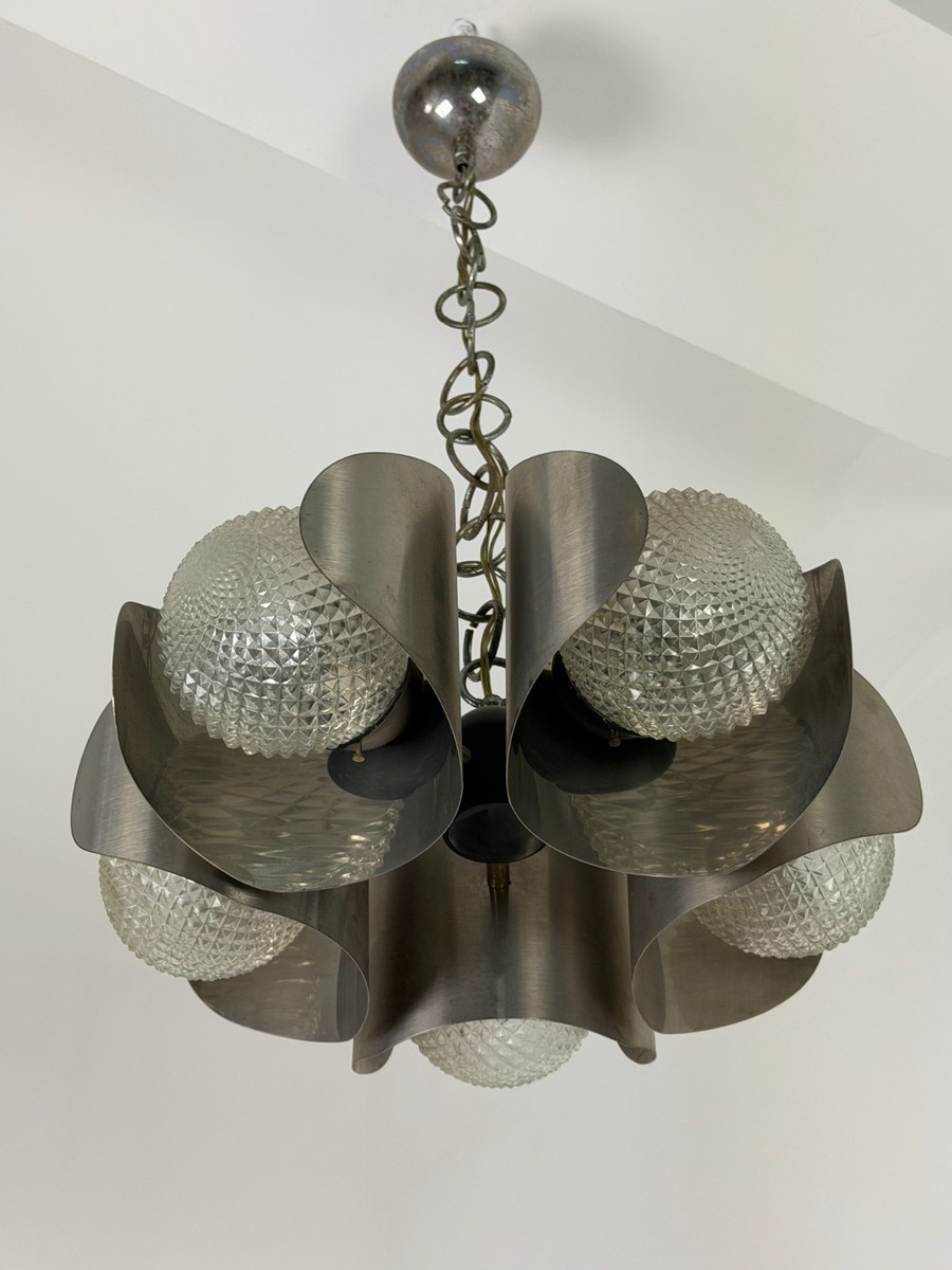 Lampadario italiano acciaio e vetro, 5-luci, anni '70