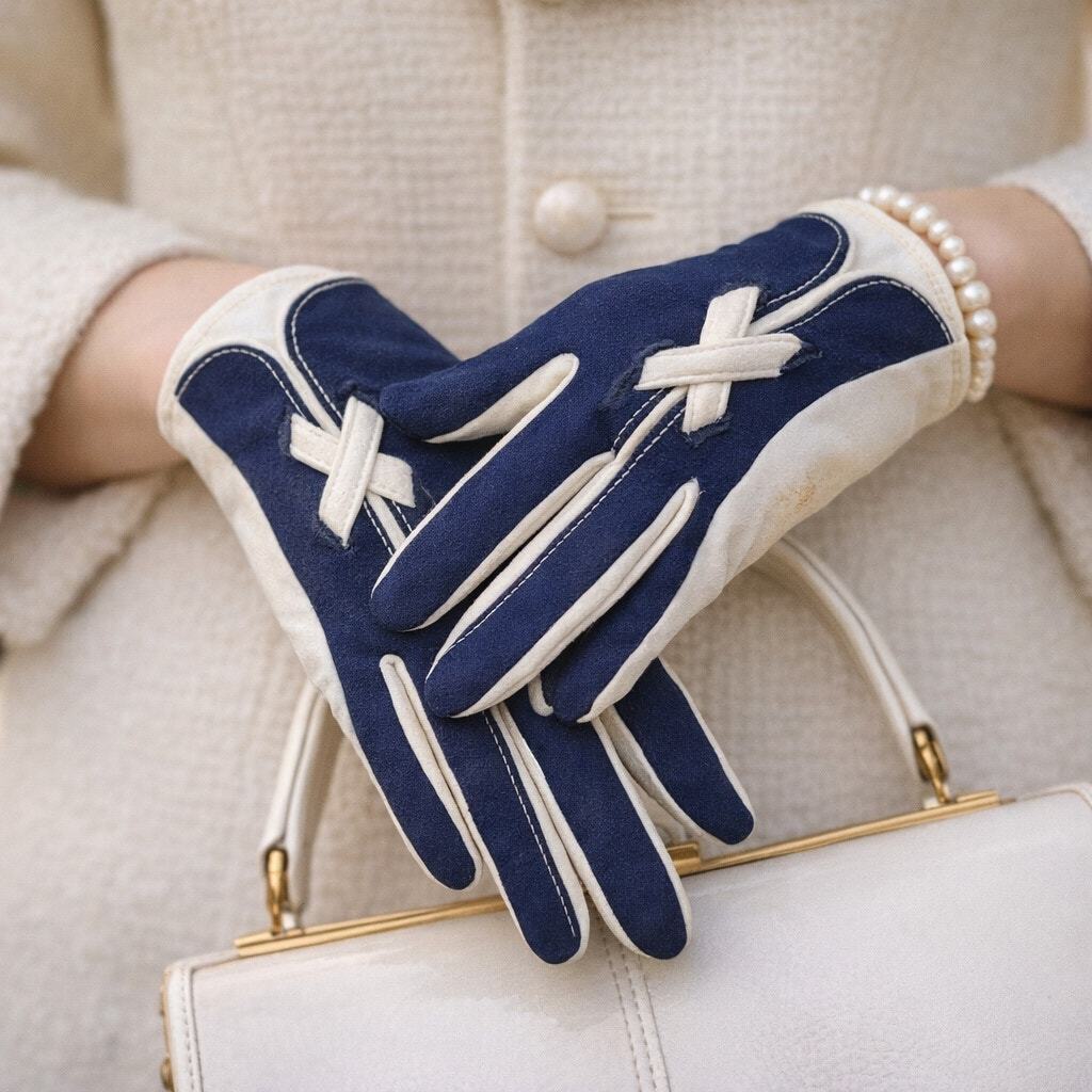 VTG 1950s 60s Navy White Nylon Gloves Lace Mod Colorblock Retro Chic S/M