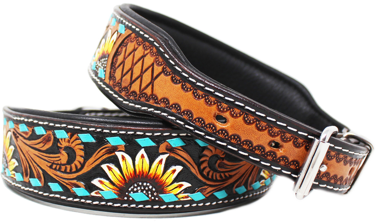 Challenger heavy-duty dog collar hand crafted from 100% genuine full grain leather and double stitched to endure everyday use. Dog collar is accented with a turquoise painted antique Vine design, with sunflowers. Soft padded back provides comfort, and helps to prevent irritation to your dogs fur or skin. Collar includes a dee-ring to easily attach identification tags or medical information. Complete with rust-free stainless steel hardware.
