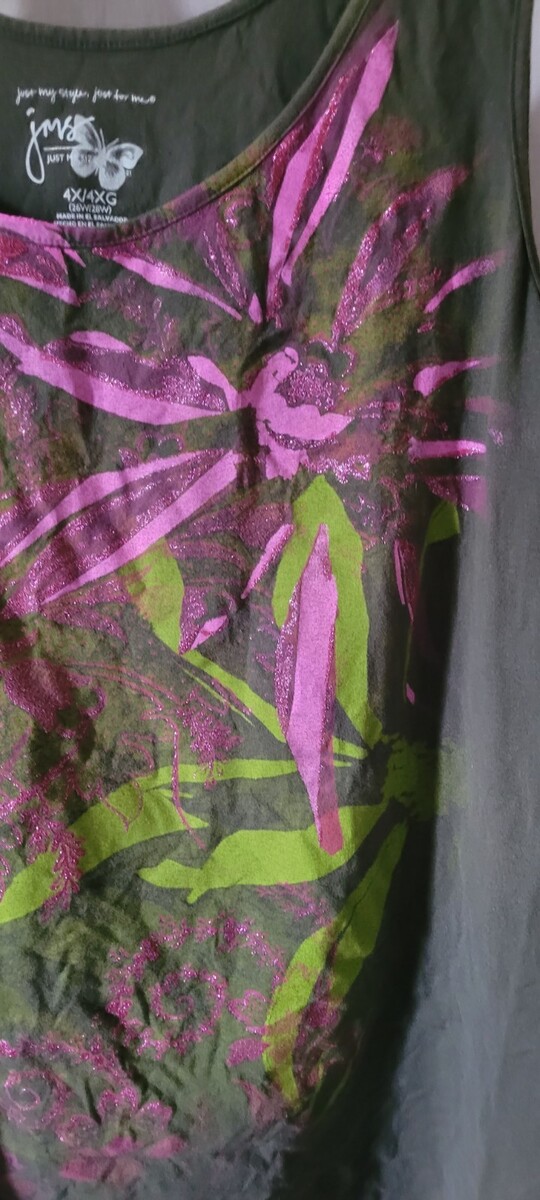 This tank top is in good used condition. There are no holes or stains that I found. The size is 4X. Measurements are approximately: Length: 30 inches. Pit to Pit: 25 inches.