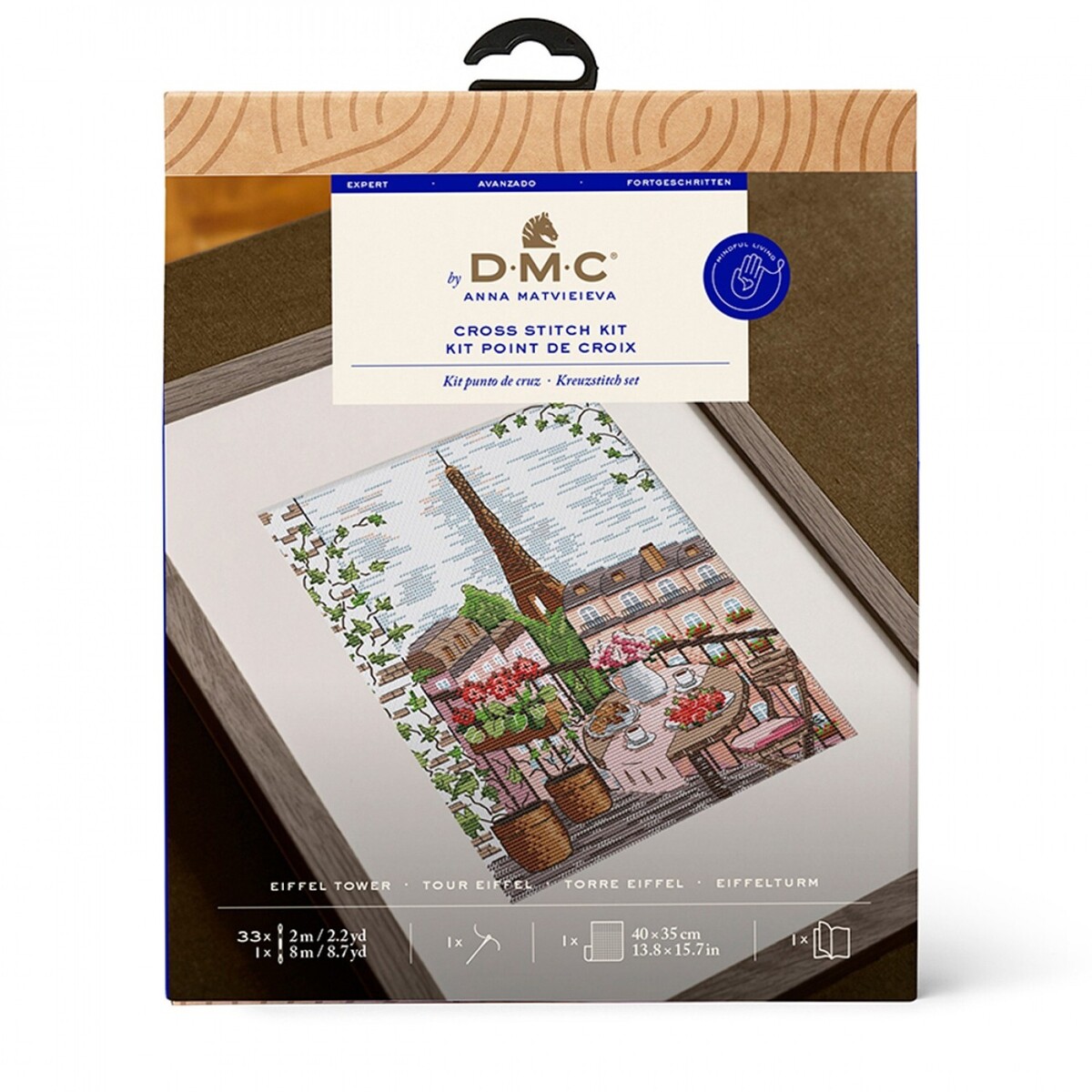 DMC Eiffel Tower Cross Stitch Kit BK1975. With Paris? most famous monument in the background, this design by Anna Matvieieva evokes the romance of a weekend in the French capital. Stitched on 14-count 5.5 pts/cm 100 percent cotton Aida with DMC Six-Strand Embroidery Floss. The kit has everything you need including clear charts and instructions. Package Contains: 33 x Six-Strand Embroidery Floss 2 m / 2.2 yd skeins - 100 percent cotton 1 x Six-Strand Embroidery Floss 8 m / 8.7 yd skein - 100 percent cotton 1 x Aïda fabric 5.5 pts / 14 ct - 40 x 35 cm / 13.8 15.7 in - 100 percent cotton 1 x cross stitch needle 1 x instructions EN / FR / SP / DE / IT / PT / NL / JA. Stitches Used: Cross Stitch, Back Stitch, Half Stitch, French Knot. Skill Level: Advanced. Design Size: 20.5 x 25.7 cm /