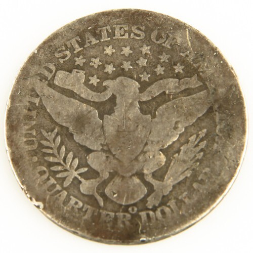 1896-O BARBER SILVER QUARTER COIN SEMI-KEY DATE GOOD CONDITION HAS CLEAR DATE HAS CLEAR MINT MARK WORN IN RIMS WITH SOME NICKS CALIFORNIA BUYERS: 9 % SALES TAX WILL BE ADDED INSURANCE DELIVERY CONFIRMATION OR SIGNATURE CONFIRMATION Please call us with any Inquiries: Continental Coin and Jewelry Company Web Department: Monday thru Friday, from 10:30am-6pm (818-781-4232) Reference Item # QUA-1032 on multiple purchases. would not be combined. We appreciate your understanding.