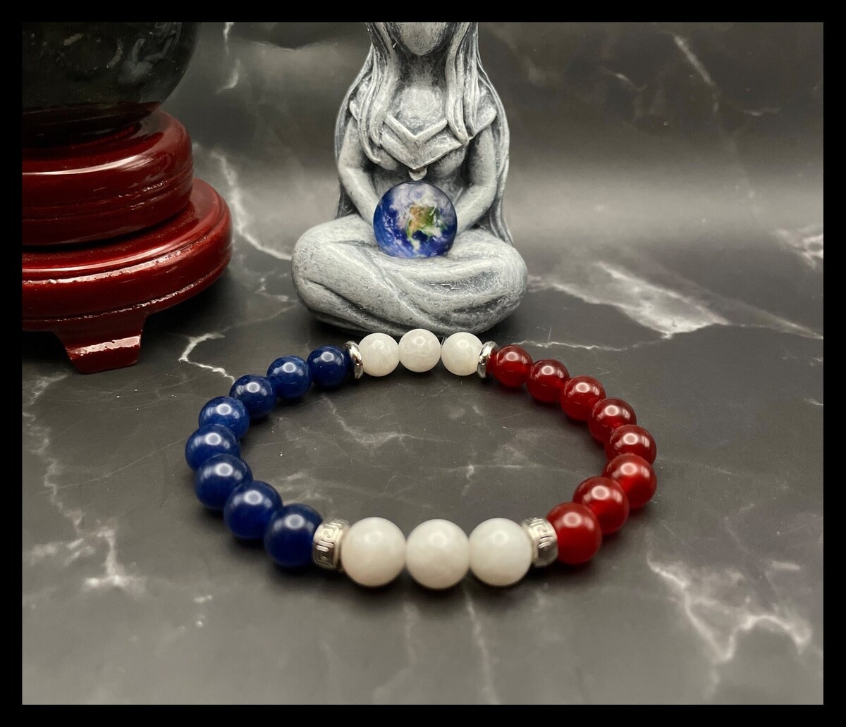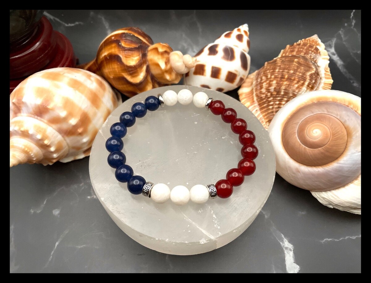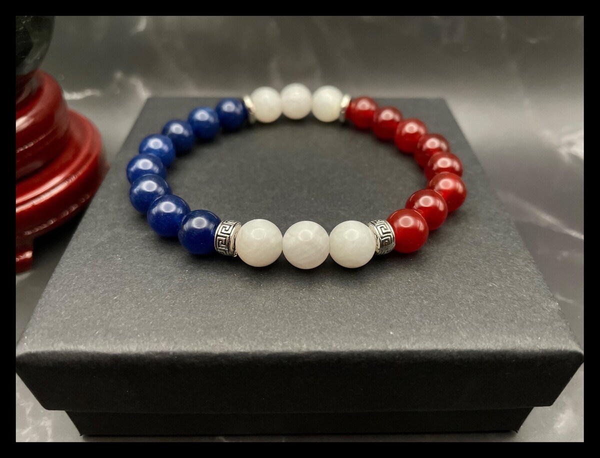 Discover the beauty of France with this exquisite gemstone bracelet, thoughtfully designed to represent the colors of the French flag. Crafted with stunning Dark Blue Quartz, luminous White Moonstone, and vibrant Red Carnelian beads, each element is carefully selected to embody the spirit of this iconic tricolor.
