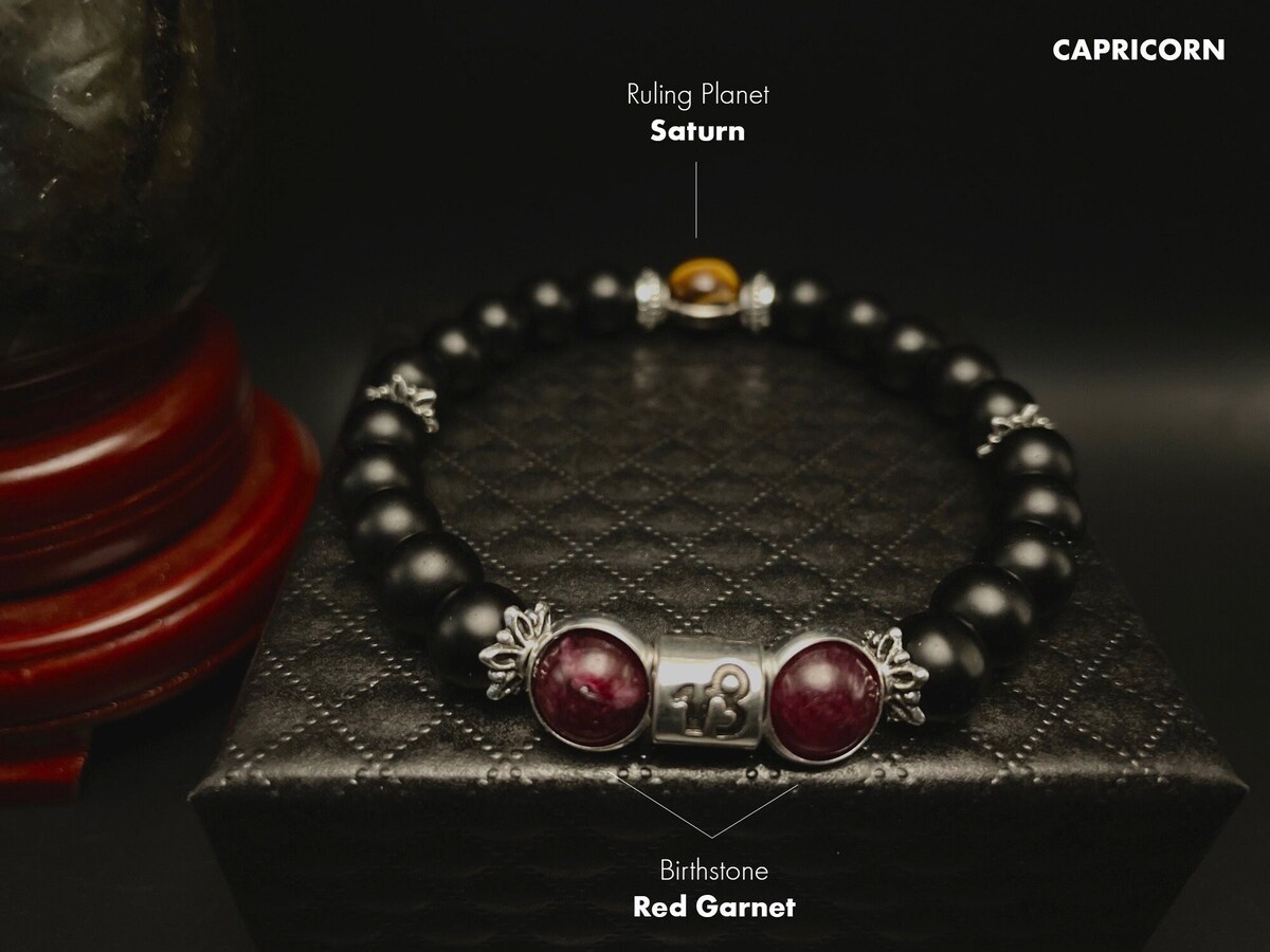 Adding to its allure is the Tiger Eye stone, positioned opposite the Capricorn charm, representing Saturn, the ruling planet of this earth sign. Tiger Eye is known for fostering clarity, focus, and disciplinequalities that echo the diligent and responsible nature of Capricorns. Together, the Red Garnet and Tiger Eye encapsulate the essence of Capricorn's positive traits, such as their steadfast resolve and ability to turn aspirations into reality. This bracelet serves not just as a stunning accessory but as a daily reminder of your innate capabilities as a Capricorn, empowering you to navigate life's challenges with confidence and grace.