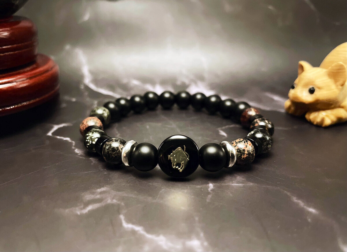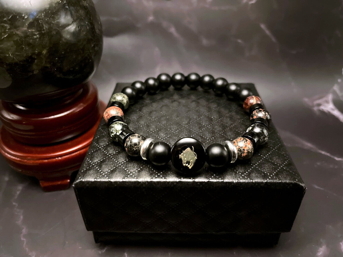 Taurus Zodiac Bracelet: Red Snowflake Obsidian & Matte Black Pearl
