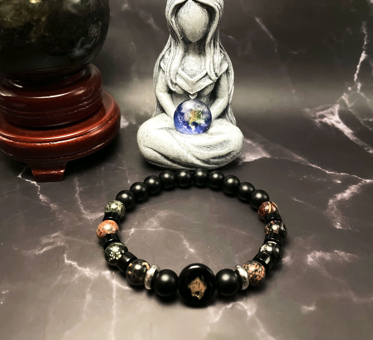 Introducing Aurora Sphere's new line of black zodiac charm bracelets. This Taurus bracelet comes with Red Snowflake and Matte Black Pearl beads along with intricately designed silver Tibetan spacers. Red Snowflake, with its stunning red crystal patterns against a dark background gives this stone its appealing aesthetic edge.