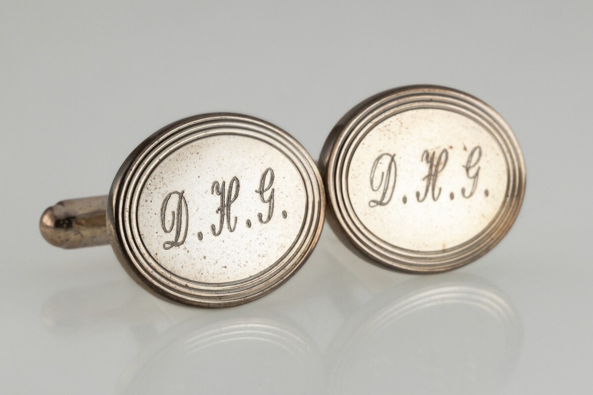 Set di gemelli trasformato a motore ovale. Su richiesta il monogramma puo essere rimosso la lettera corrente letta "dhg" nelle lettere di script