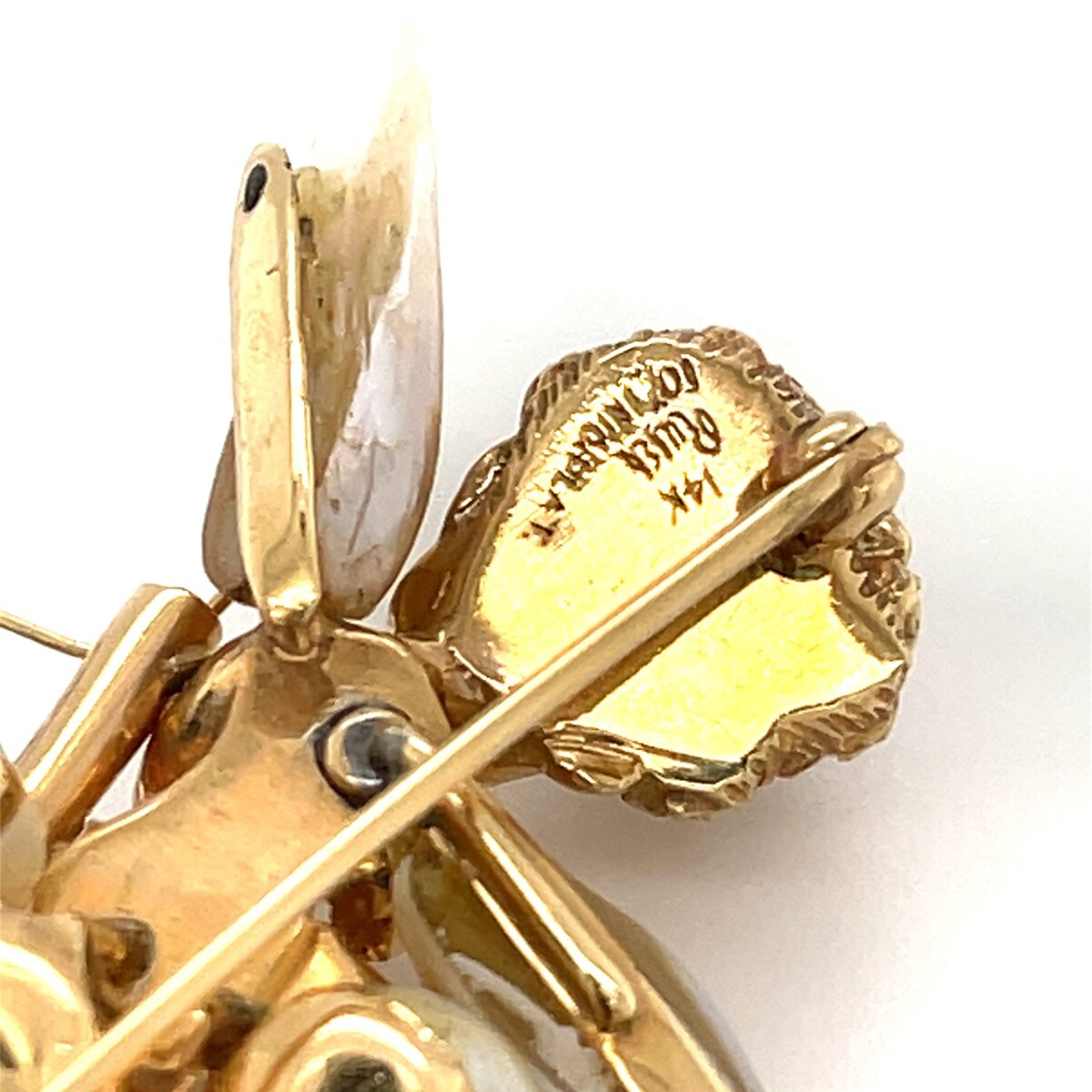 Ruser 14K Yellow Gold Bee Brooch w/ Mississippi River Pearl Wing Sapphire Eyes