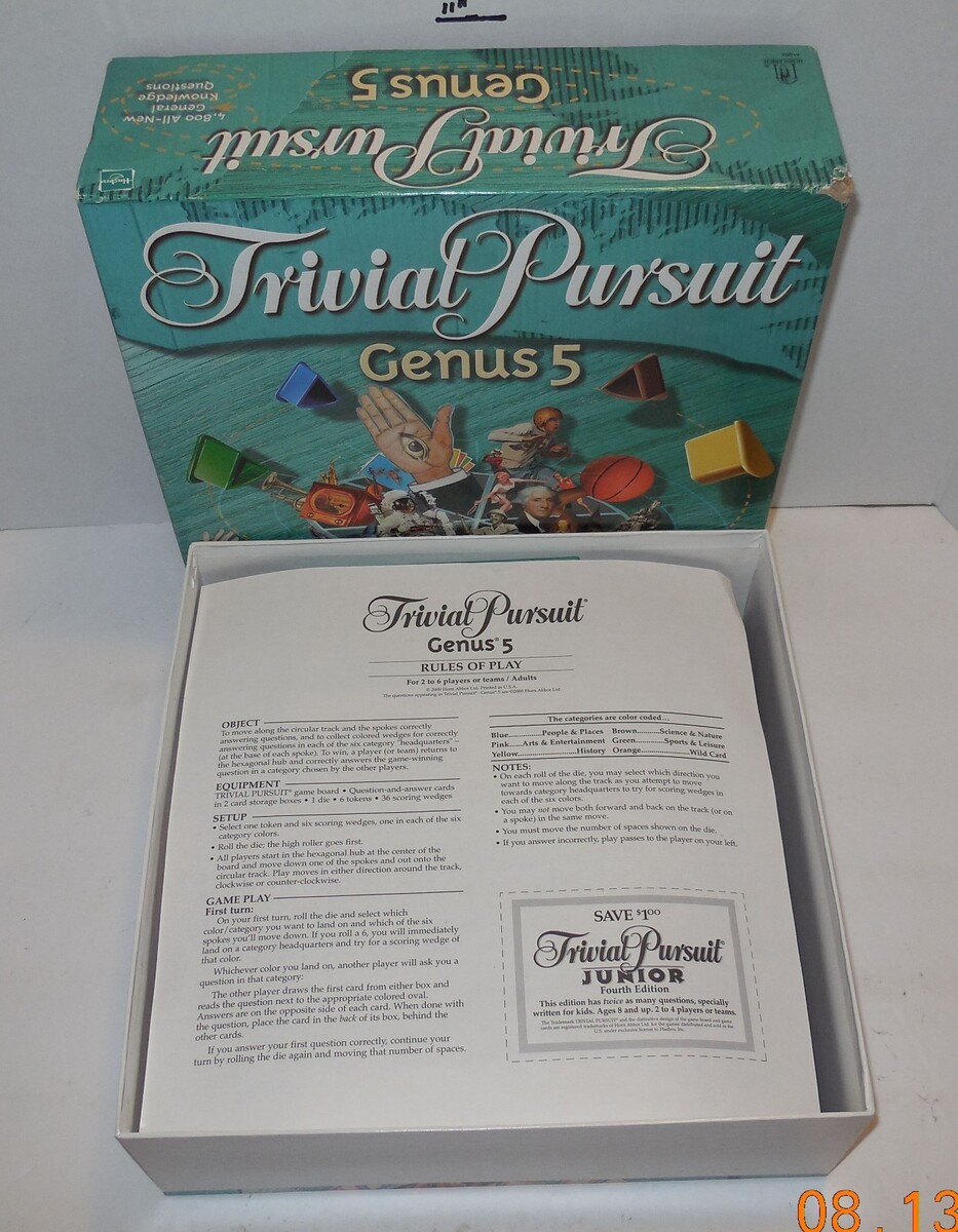 For Sale is a 2000 Hasbro Trivial Pursuit Genus 5 Board Game 100% COMPLETE. it in good Used condition. comes with the Pieces as seen in the pictures provided what you see is what you will receive. Please ask Any and All Questions prior to purchasing. Fast Same or Next day shipping with Free Delivery Confirmation within the U.S. Payment Due within 7 days of purchase (if you need more time please let us know In advance) we love to combine shipping is always a Yes and Most of the time Additional Items Ship for free.