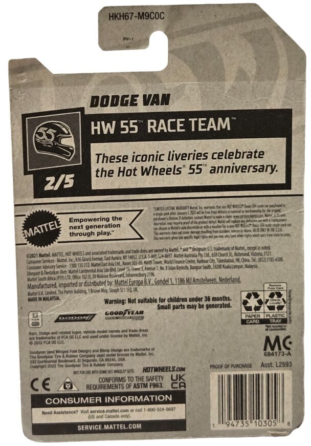 Add a piece of Hot Wheels history to your collection with this Dodge Van from the 2022 HW 55th Race Team series. This 1:64 scale die-cast features the iconic "55th Anniversary" livery, celebrating over five decades of speed.