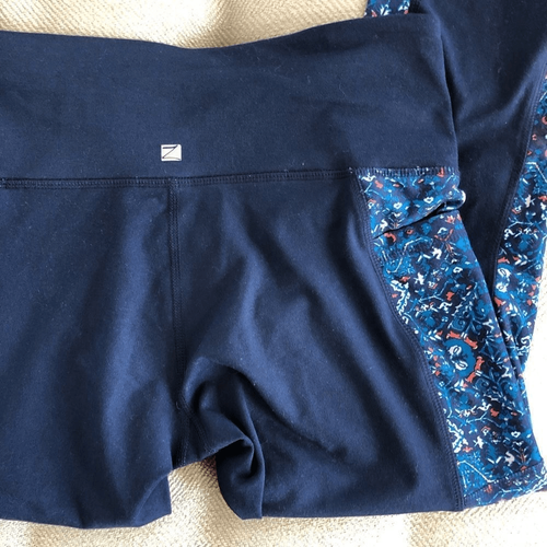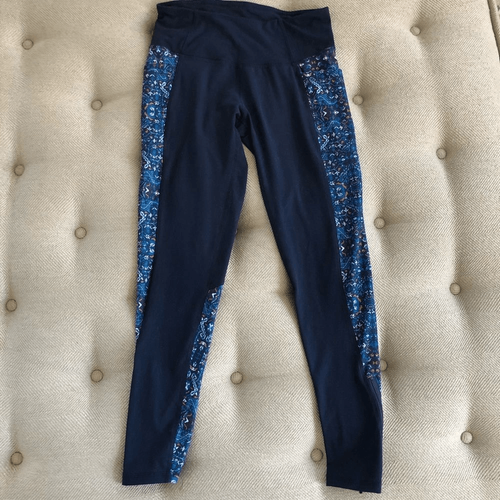 Z by Zobha Blue work out exercise leggings with zipper ankles and hip pockets in the print panels that wrap around the front to the back. No signs of wear. Size small, 4/6