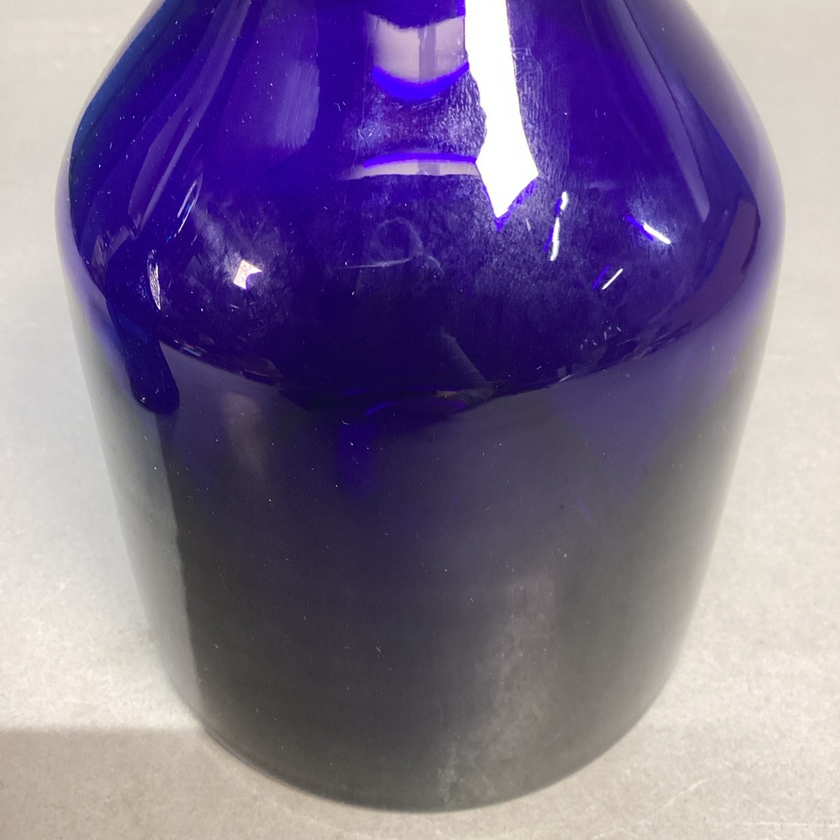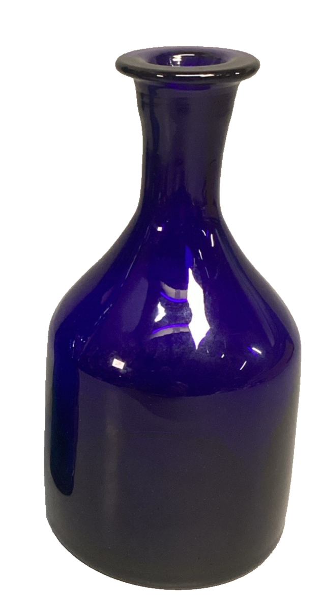 The cobalt blue decanter doesn?t have a stopper and it has some scratches on the sides and base. This measures 8.75?Hx4.5?D measured at the base. This could also be used as a vase.