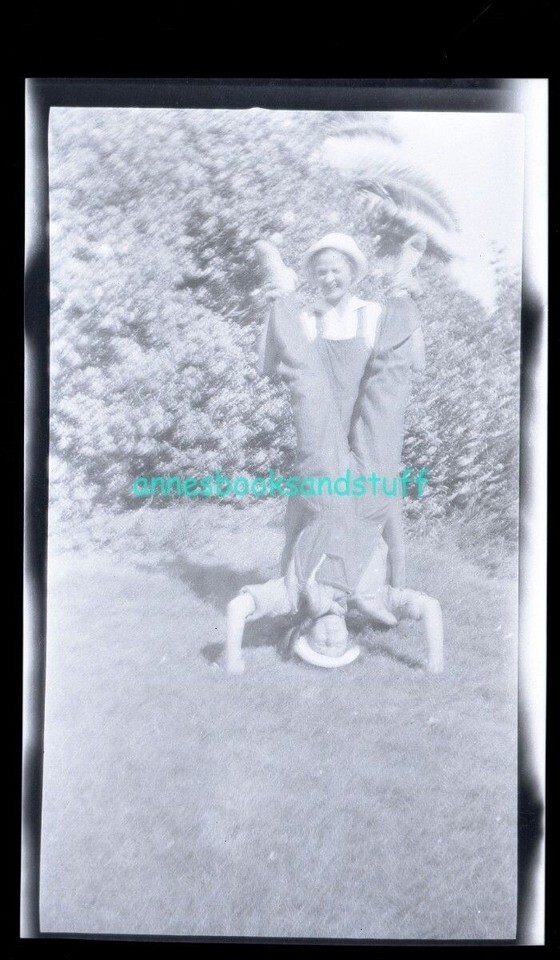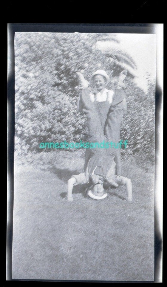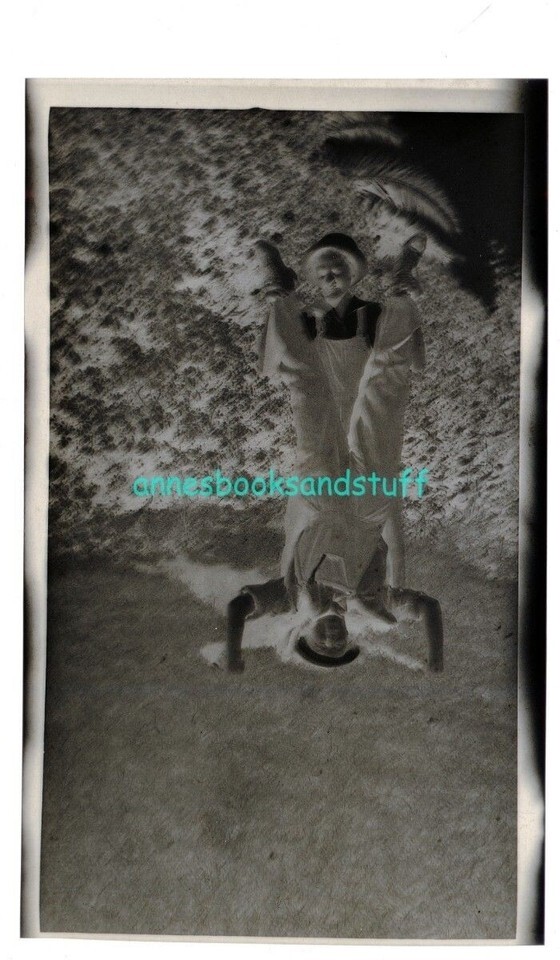 black and white negative - 2 men in overalls horsing around handstand on lawn