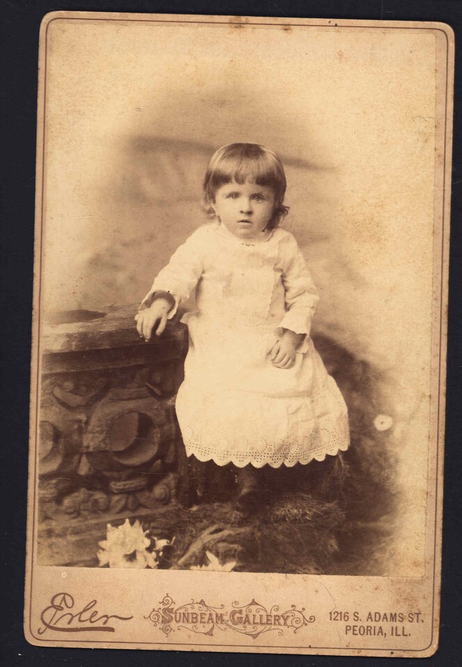 STUDIO CABINET CARD PHOTO * Erler SUNBEAM GALLERY Peoria ILL Toddler on bench