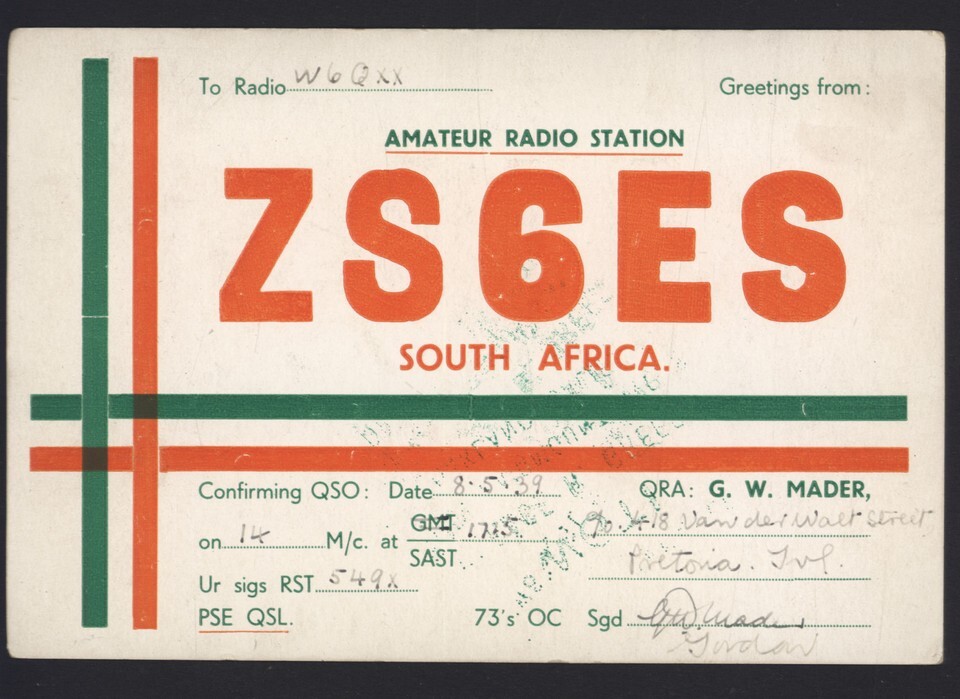 QSL CARD ham radio card * ZS6ES 1939 Pretoria South Africa Gordon Mader oper.