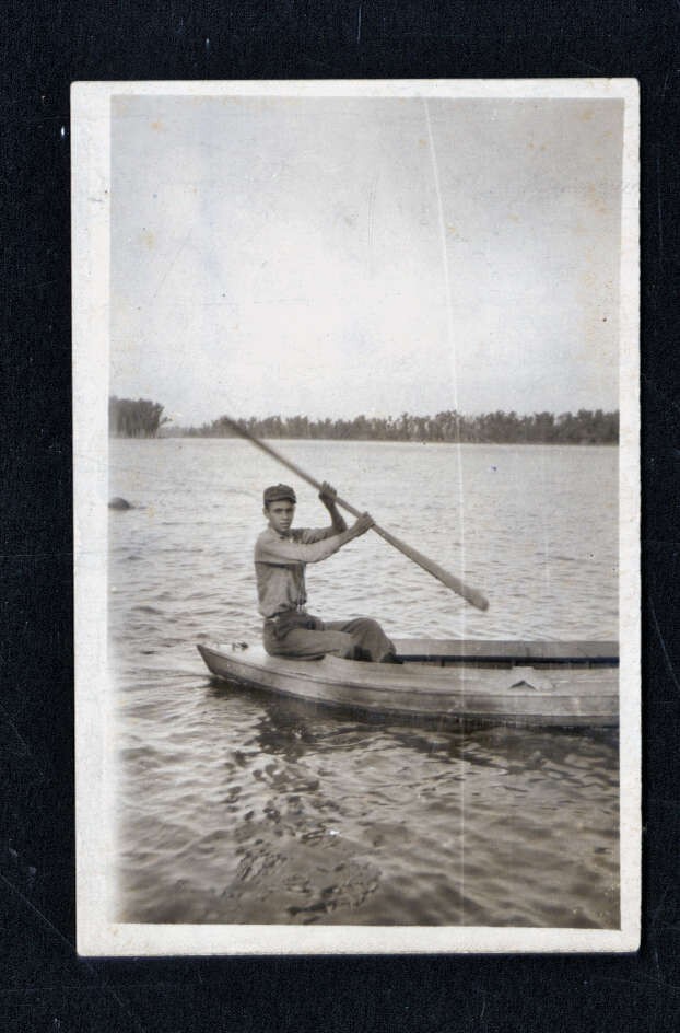 SNAPSHOT from ALBUM * MAN in KAYAK or ROWBOAT Holding Paddle on Lake? no locatio