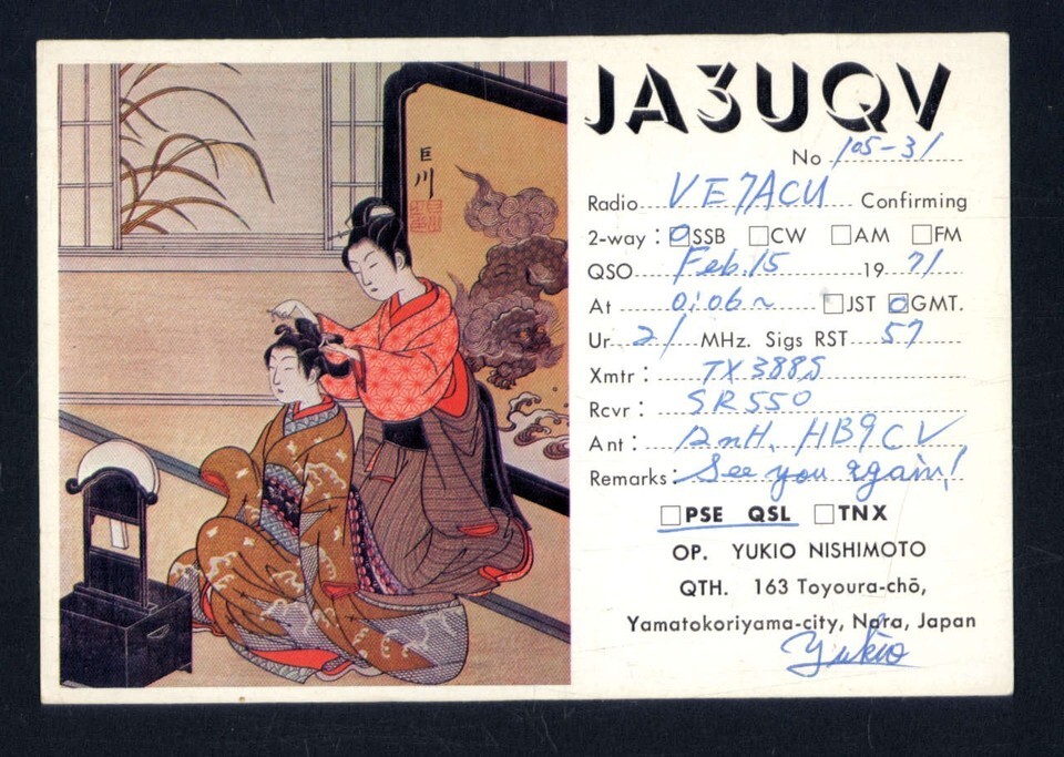 QSL CARD ham radio card * JA3UQV Nara JAPAN 1971 Yukio Nishimoto Bureau stamp