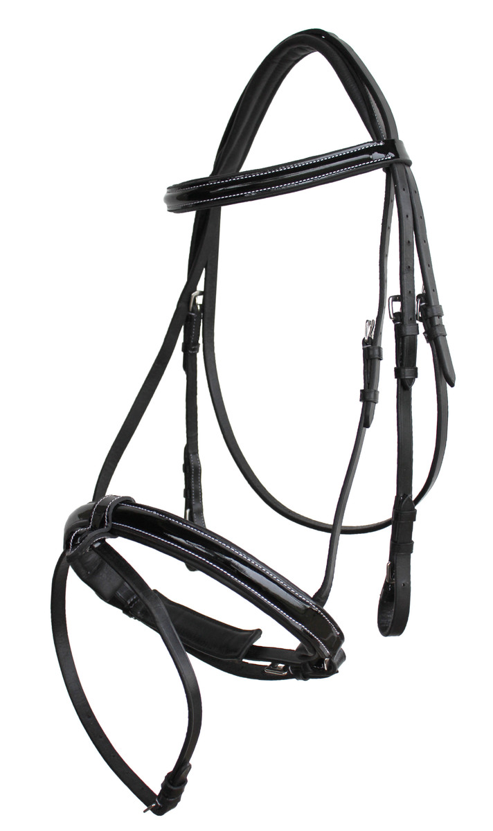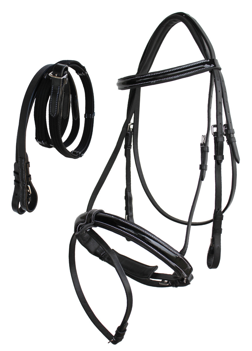 Challenger all-purpose English bridle with removeable flash crafted from high-quality leather is perfect for everyday use. Features a well padded crown, browband, and noseband for comfort. Non-rust stainless steel hardware, and double stitched throughout for durability. Bridle has a shiny black glossy finish throughout for a unique look. Comes with matching 9' x 5/8" nylon webbed reins for grip with leather stops and buckle ends. Size: Cob