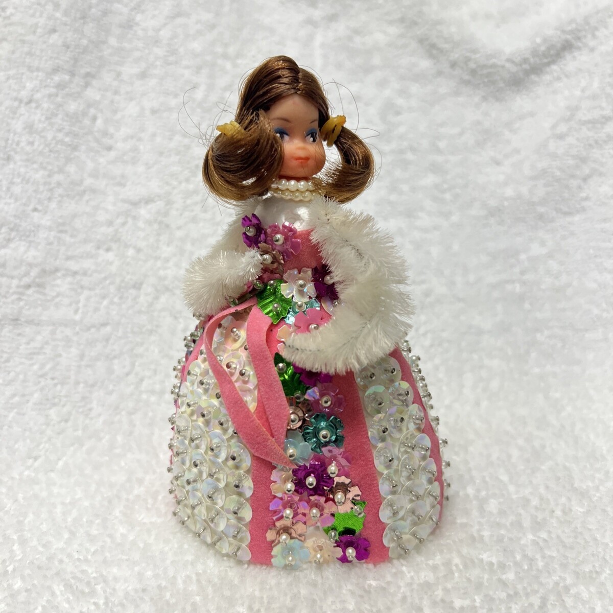 Vintage Doll Beaded Sequin Push Pin Brunette Flowers PINK 5" Love the sequin flowers